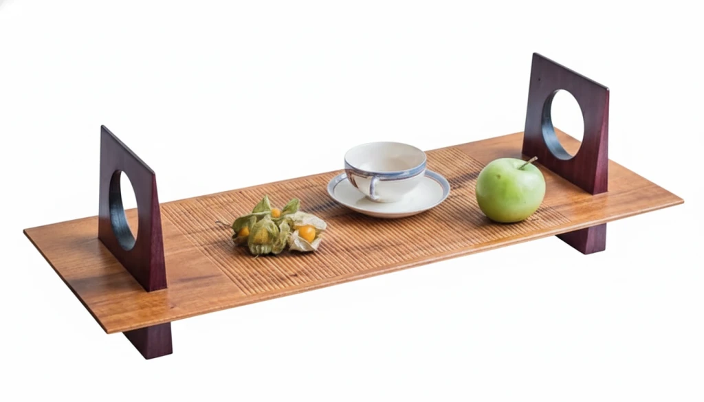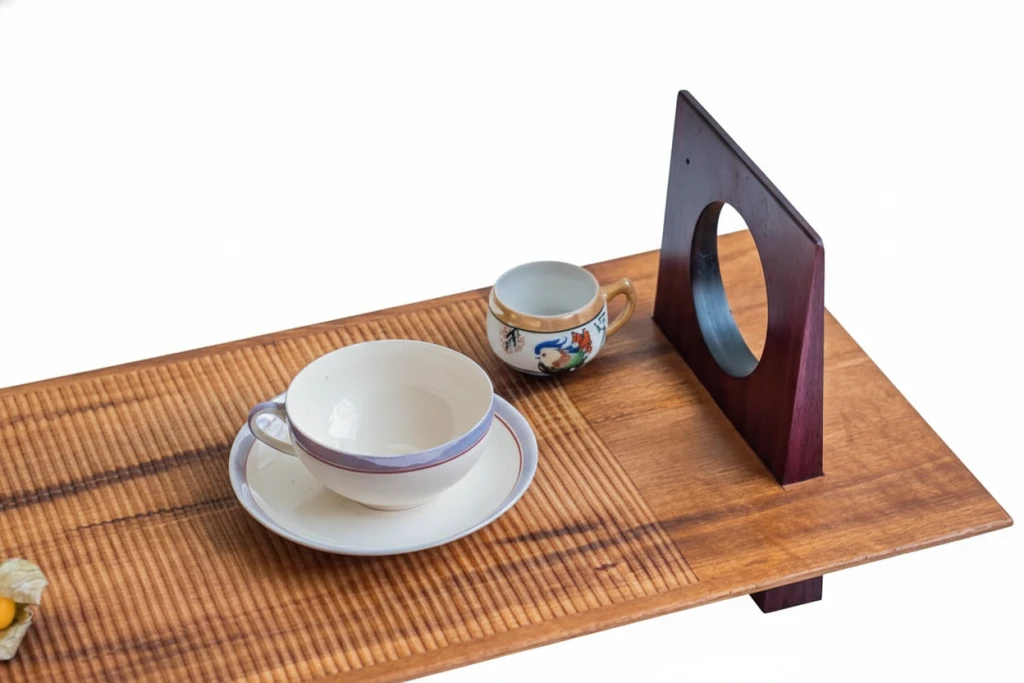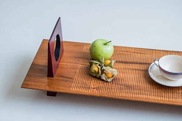 Bandeja artesanal confeccionada em madeira maciça de muiracatiara, com detalhes entalhados manualmente. Seus suportes laterais apresentam recortes ovais vazados que facilitam o manuseio, enquanto a superfície ranhurada agrega sofisticação ao design.