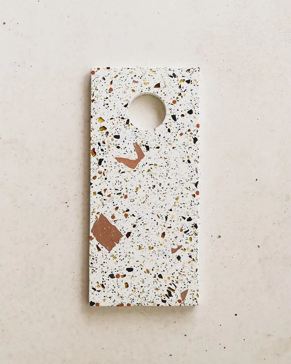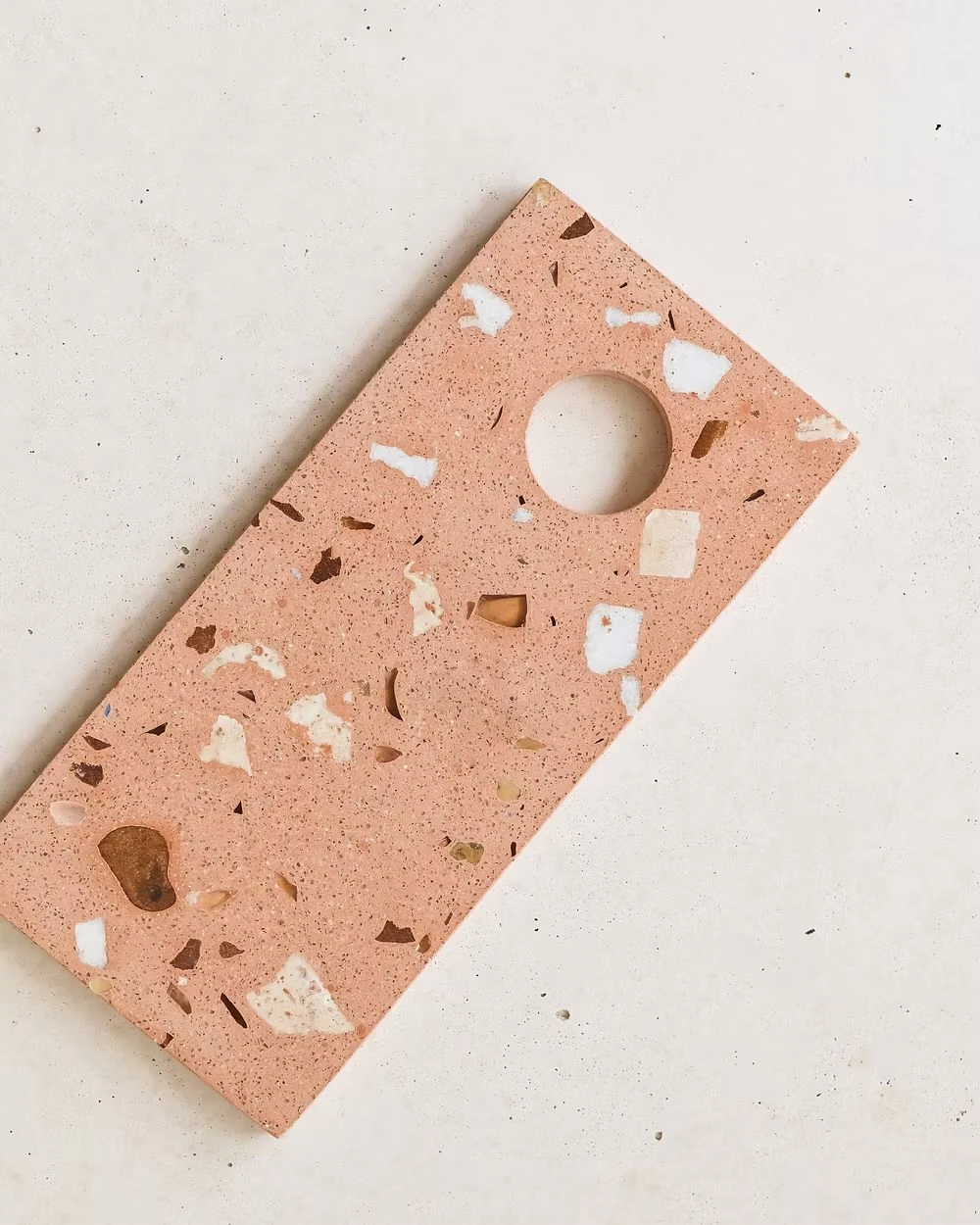 Bandeja de servir em tamanho médio com composição terrosa vermelha especial, cristais reciclados oriundos de Minas Gerais e pedras selecionadas recuperadas de marmorárias no Rio de Janeiro. Feita com a técnica tradicional do terrazzo venezino de forma singular.