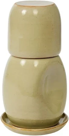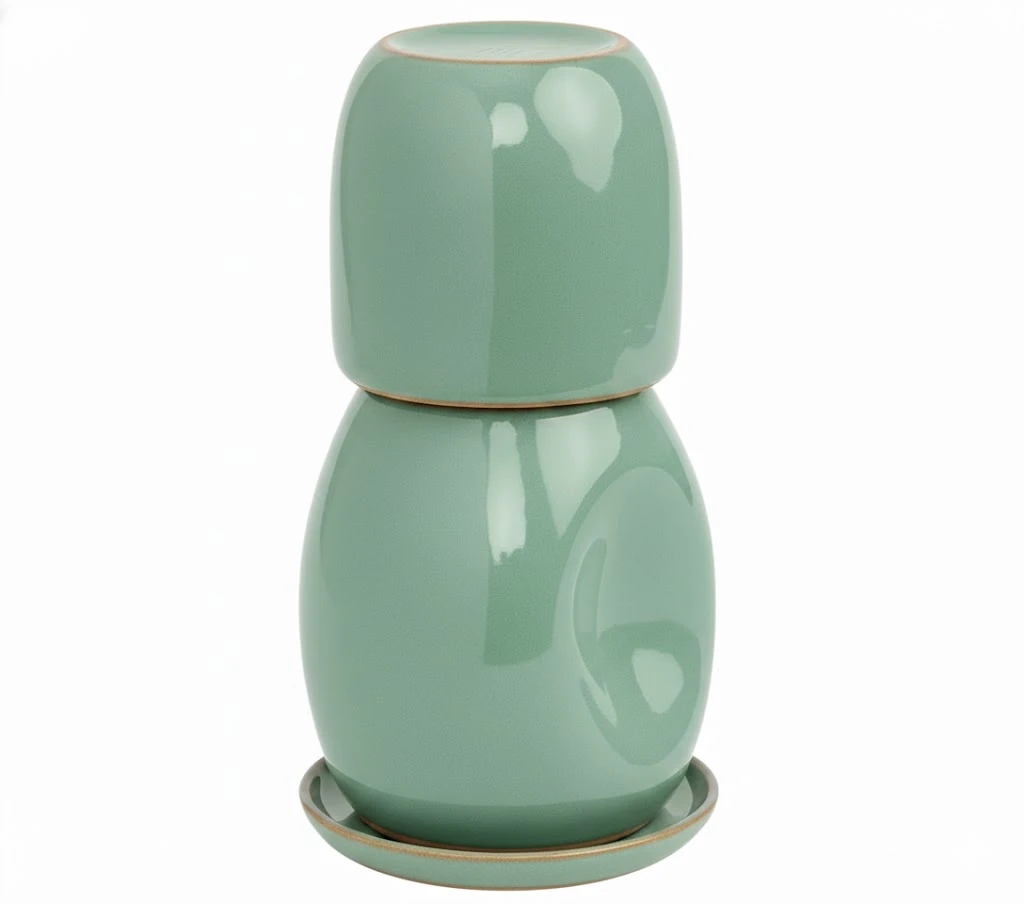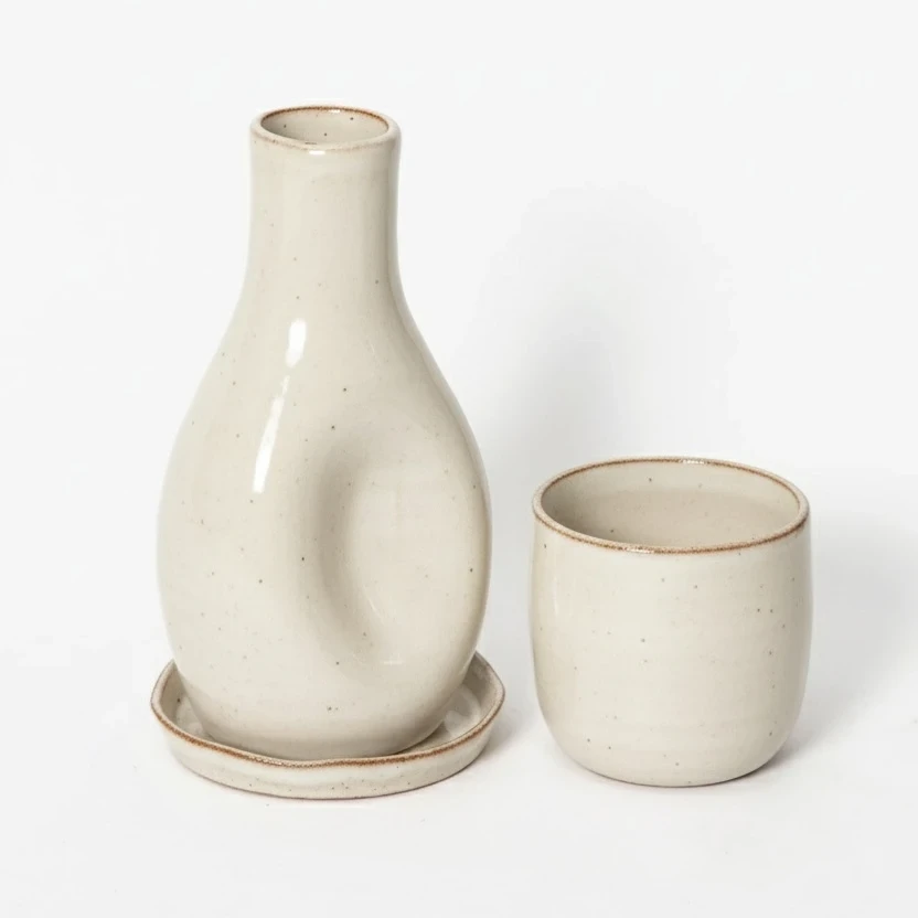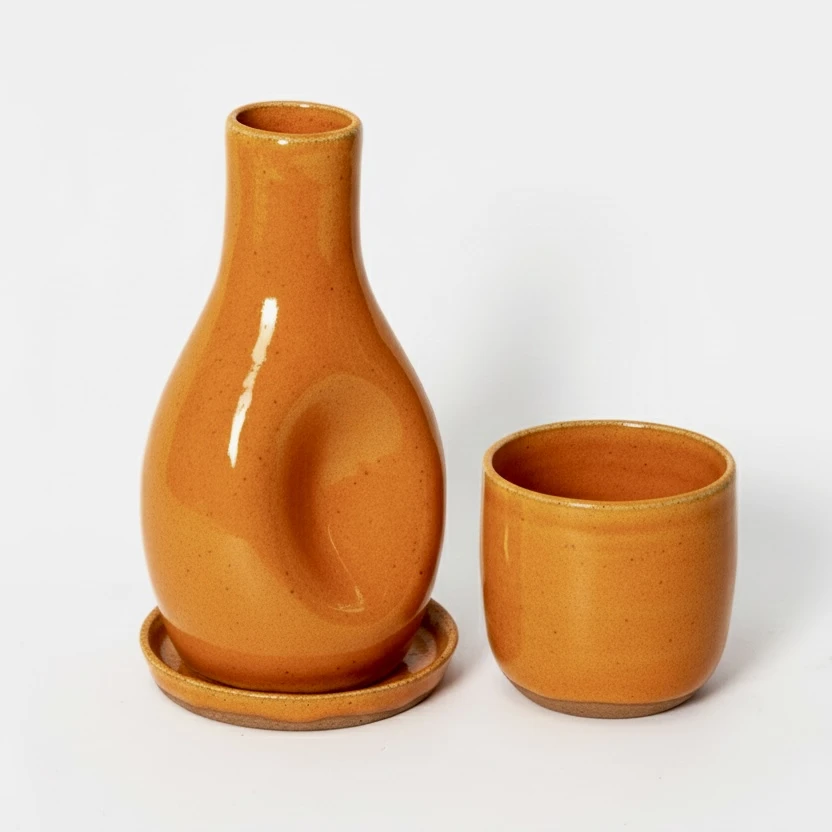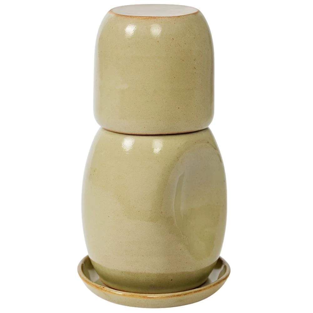 Conjunto de moringa composto por três peças em cerâmica: moringa (650ml), copo (450ml) e prato. A produção artesanal confere singularidade a cada peça, com variações naturais de tom e intensidade de cor que fazem parte do processo criativo.