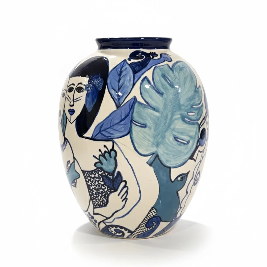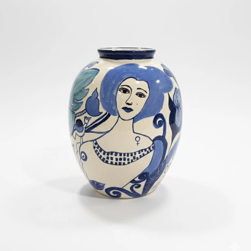 Vaso de cerâmica pintado a mão com várias faces diferentes.