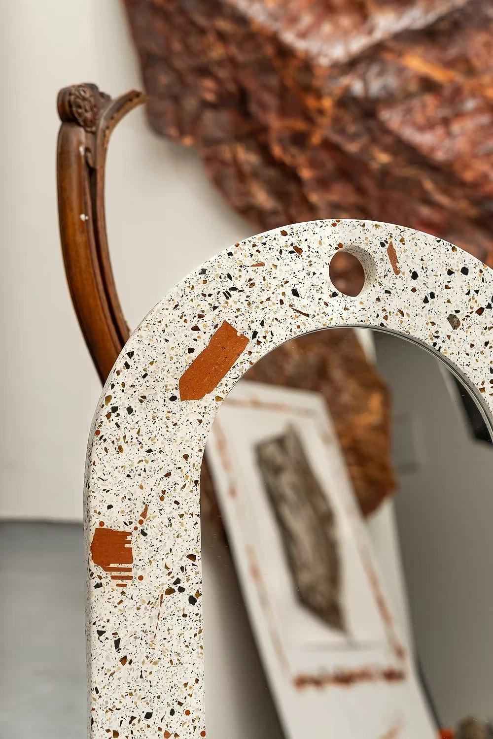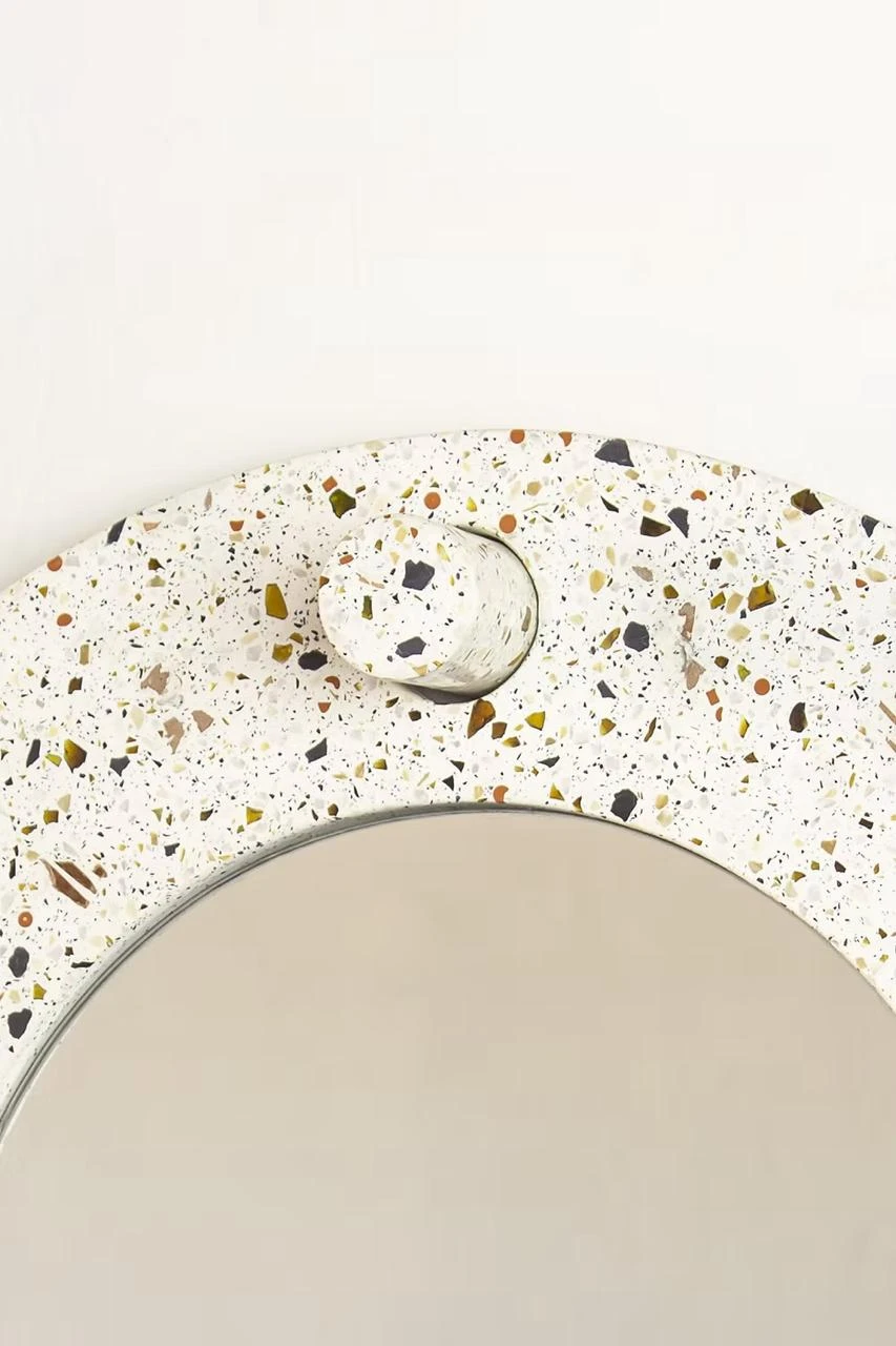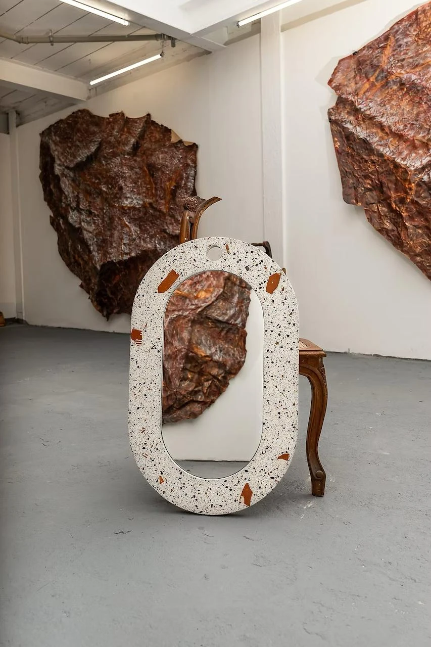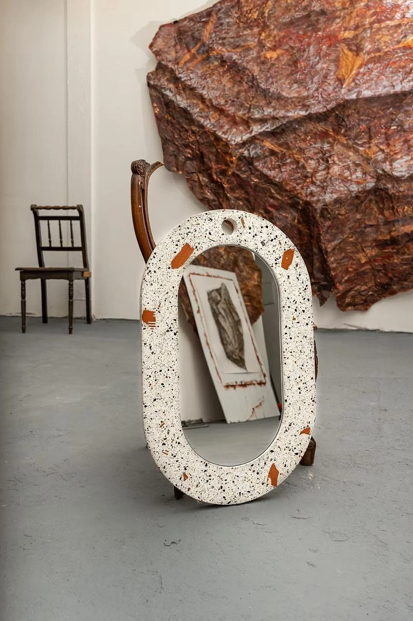 O mono é um espelho robusto feito em granilite contemporâneo, pesando 15 kg que flutua preso a parede apenas por um gancho.