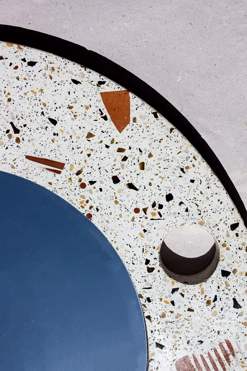A técnica tradicional do granilite permite combinar resíduos da indústria como vidro, plástico, tijolos cerâmicos e pedras recuperadas de forma singular a cada peça feita.