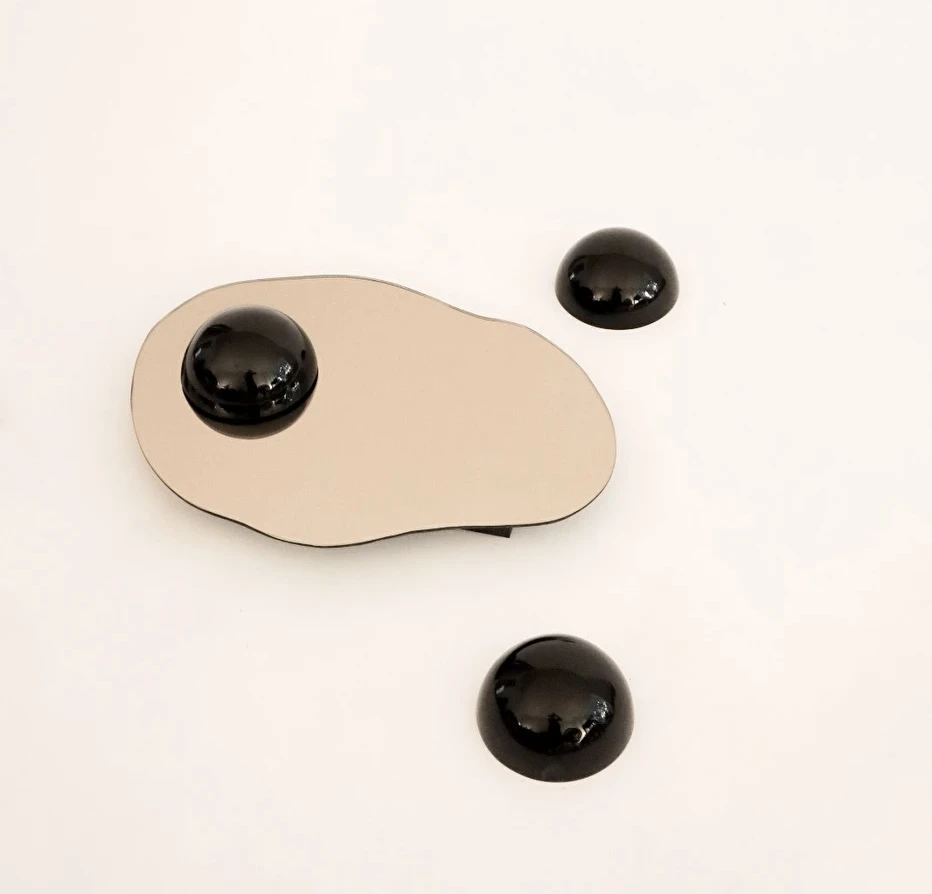 Espelho pequeno da Série Ciclos, que também pode ser utilizado como bandeja decorativa. Possui base em madeira e detalhe de semiesfera em resina preta, conferindo contraste e organicidade ao design. Peça artesanal, delicada e única, ideal para apoiar sobre móveis ou fixar na parede como elemento artístico. Limpar apenas com pano seco, sem uso de produtos químicos ou abrasivos.