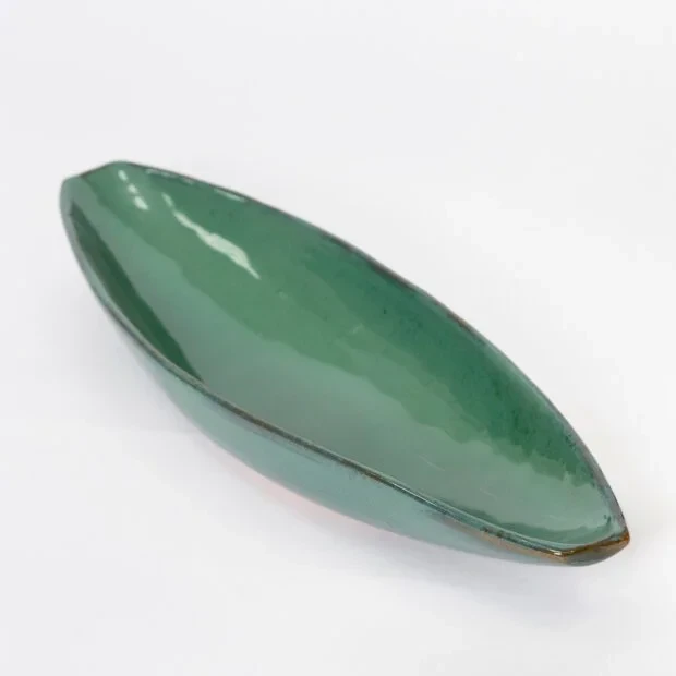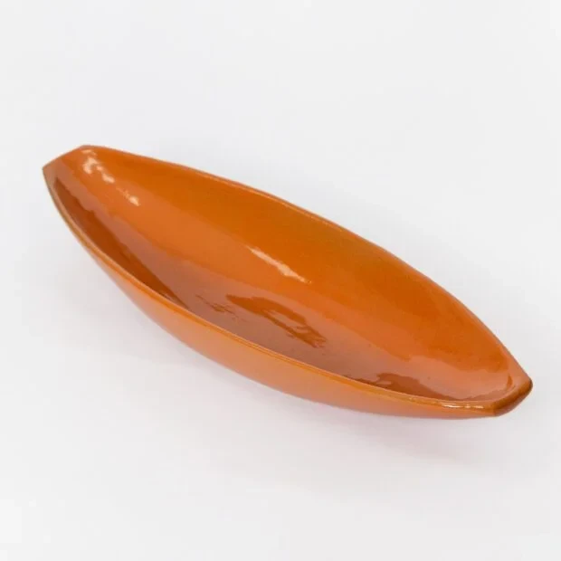 Canoa em cerâmica vitrificada com acabamento brilhante em tom terracota. Design alongado e orgânico, ideal para servir aperitivos, petiscos, azeitonas ou como peça decorativa. A peça possui dimensões de 47 x 17 x 8cm e capacidade de 500ml, sendo confeccionada em cerâmica vitrificada com cor terracota/laranja queimado e acabamento brilhante.