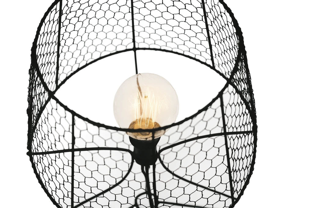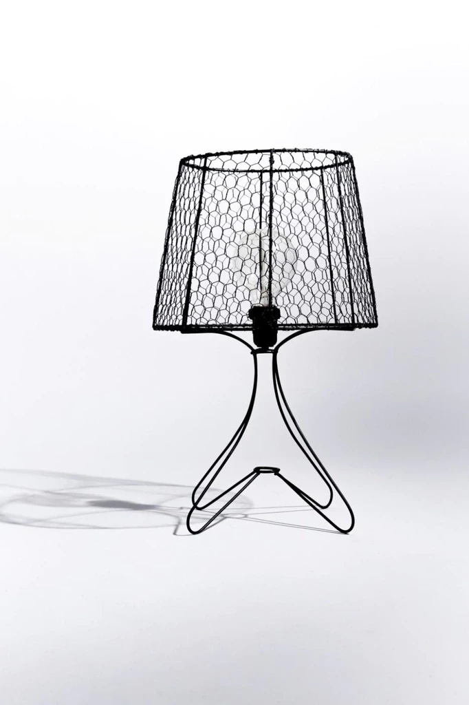 Luminária em fio metálico com estrutura leve e transparente. A trama em colmeia cria um jogo de luz e sombra que valoriza o contraste entre o vazio e a matéria. O desenho geométrico da base e da cúpula confere equilíbrio visual, unindo funcionalidade e expressão escultórica em uma peça de aparência flutuante.