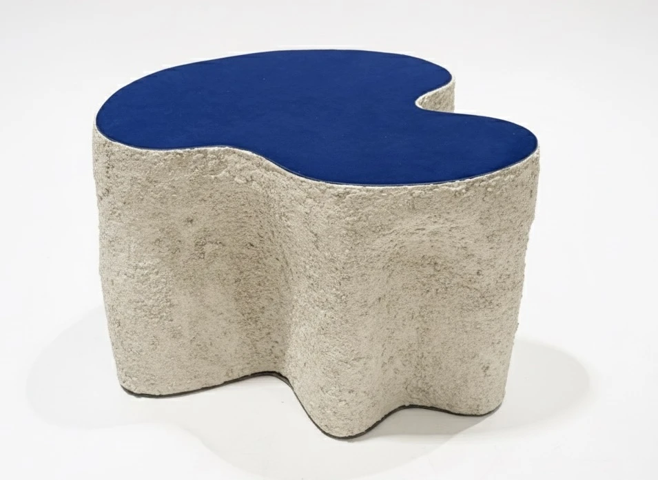 Garden seat em cerâmica com formas biomórficas moldadas à mão, inspirado nos Gondes, antiga tribo da Índia conhecida por suas pinturas de árvores imaginárias. A peça apresenta textura que remete à pedra bruta nas laterais e acabamento esmaltado em azul profundo no topo, funcionando tanto como assento quanto como mesa lateral. Por ser produzida manualmente, cada exemplar é único e carrega as marcas do processo artesanal, conferindo presença escultórica ao objeto através do contraste entre a textura natural e o azul vibrante.