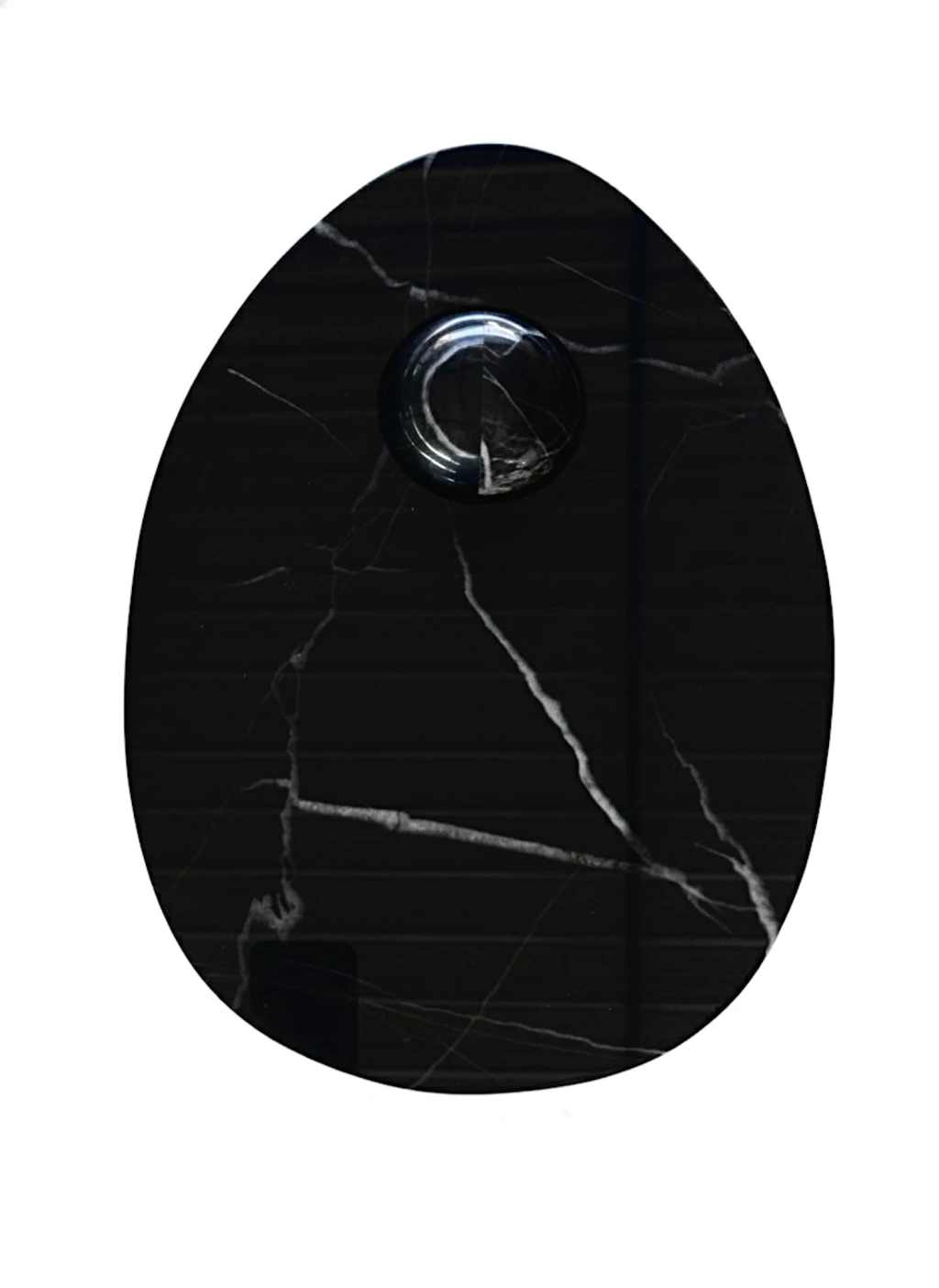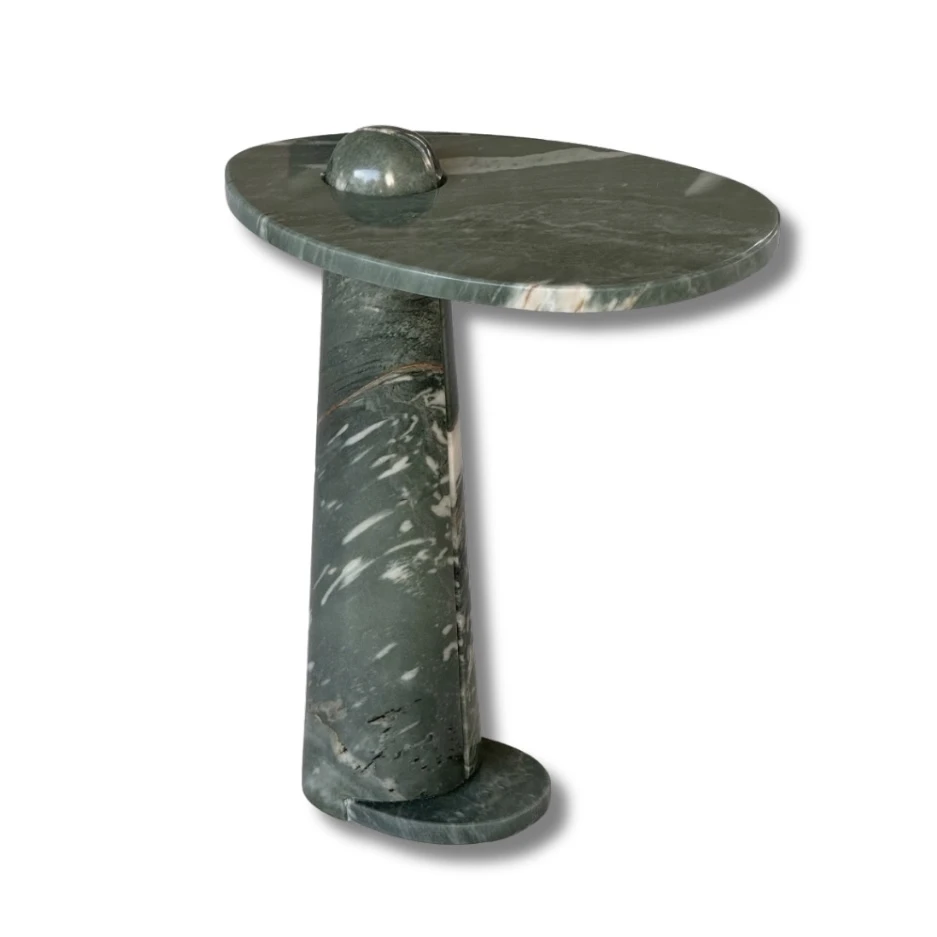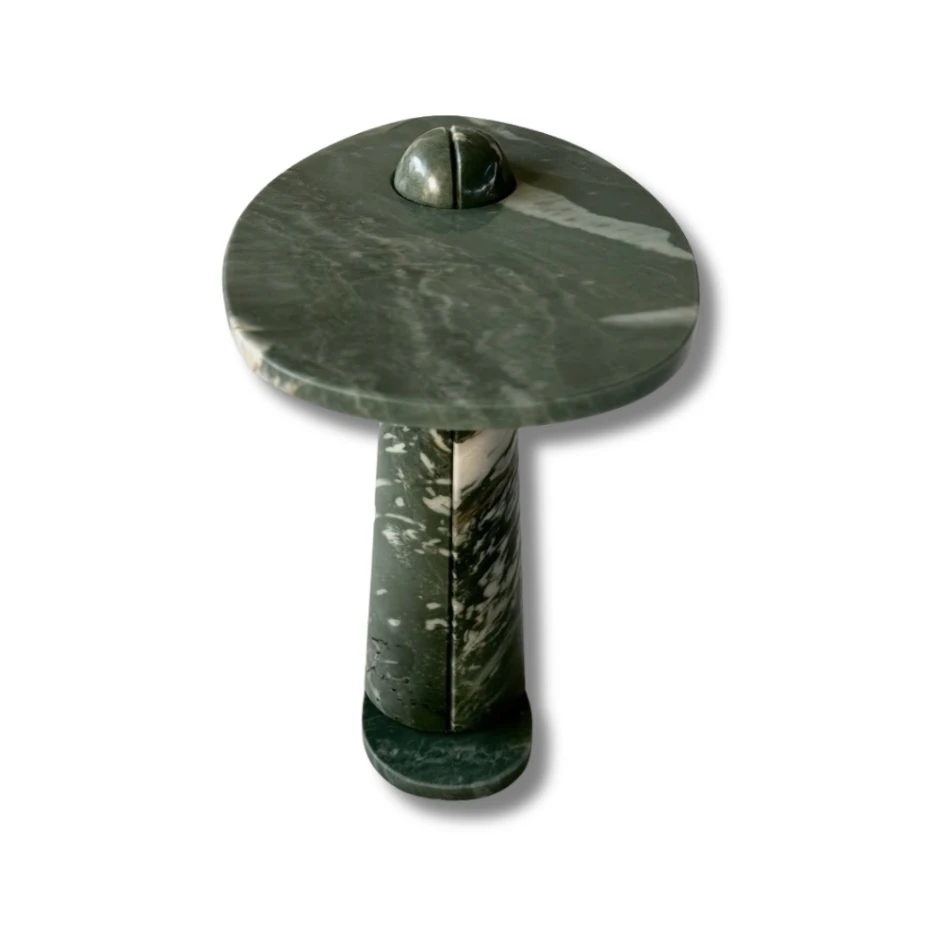 Mesa lateral Cogumelo em quartzito natural, disponível nas cores Vivid Green e Venon. A peça tem tampo circular com leve desnível e base cônica, ambos em acabamento polido que evidencia as variações da pedra. Combina forma escultural e funcionalidade em proporções compactas.