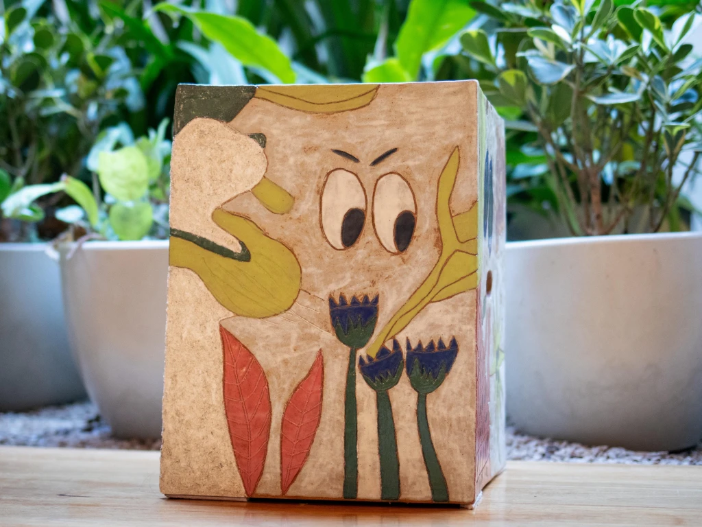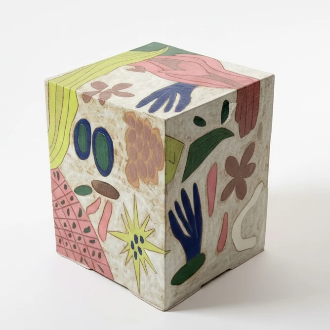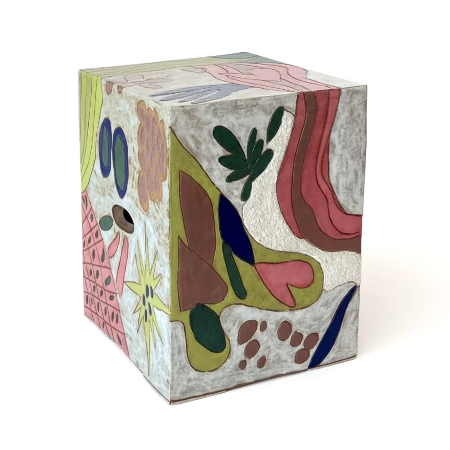 Peça decorativa única em cerâmica com pintura artística e ilustrações coloridas em todas as faces. Design versátil que funciona como banco, apoio lateral ou seat garden. Pode receber tampo de vidro para ampliar as possibilidades de uso.