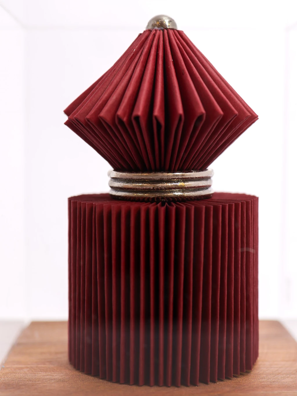 Escultura em papel na cor vinho, com detalhes metálicos, base em madeira e caixa acrílica. Peça compacta e geométrica, ideal para compor mesas e prateleiras.