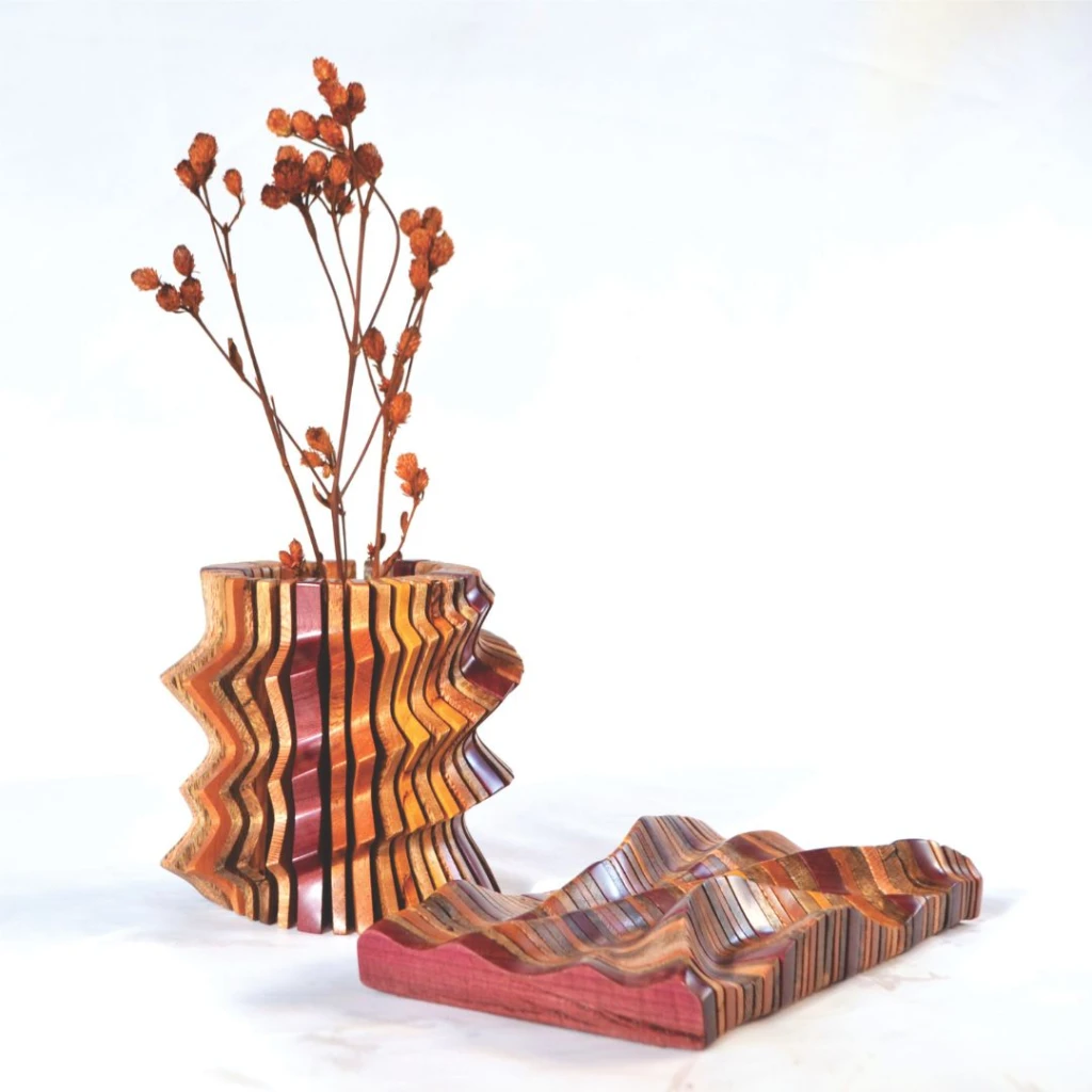 Peça esculpida a mão com sobras de madeira e lixas de cinta descartadas. A coleção é composta por peças articuladas que possibilitam vários usos. Quando usada aberta pode ser um centro de mesa ou escultura de parede e quando fechada podem ser utilizada como cachepô.