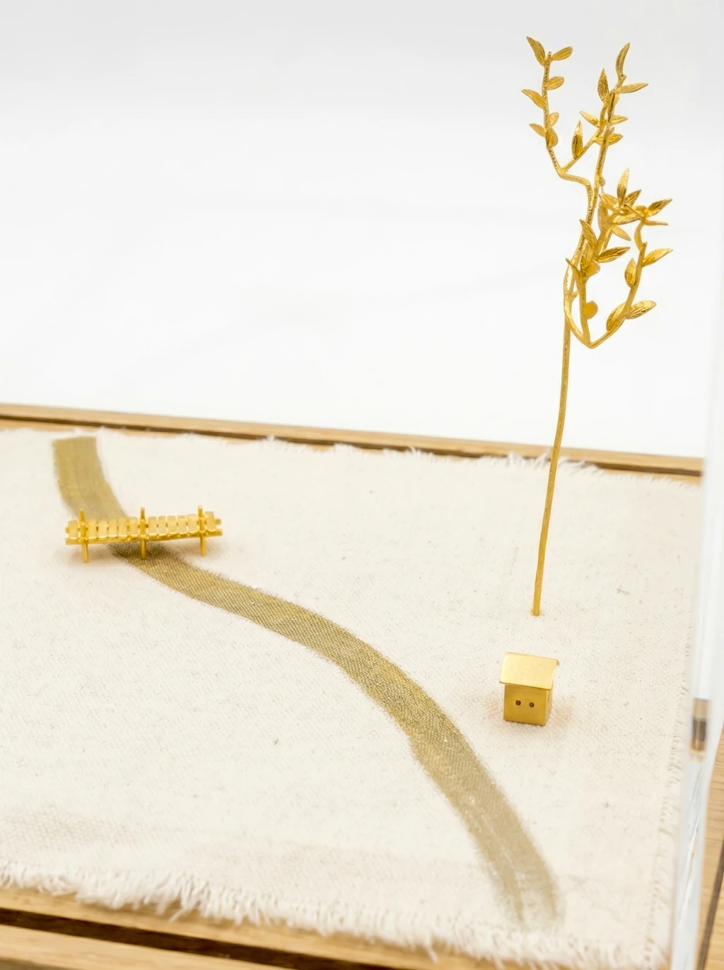 Escultura em caixa de acrílico com base em madeira, composta por elementos metálicos dourados sobre tecido. Composição minimalista que sugere paisagem abstrata e percurso.