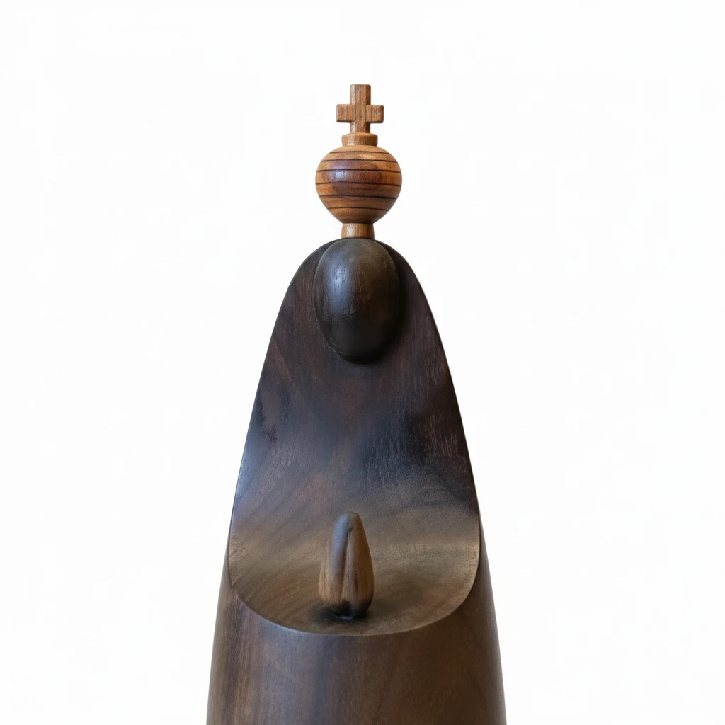 Escultura em madeira maciça torneada com forma de oratório, finalizada com cruz no topo. Produção artesanal em pinho-de-riga. Acabamento em óleo mineral e cera orgânica que preserva a textura e aroma naturais da madeira. Cada peça é única devido às características do material. Madeira proveniente de revendedores registrados e sobras de demolição.