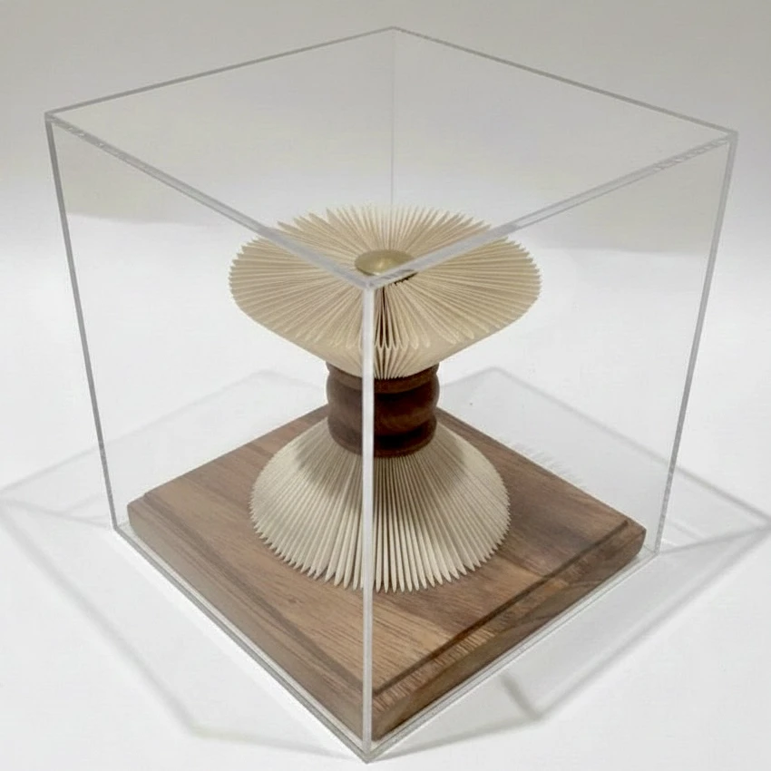 Escultura em papel plissado bege com dois elementos circulares sobrepostos, interligados por esferas de madeira torneada. Base em madeira maciça.