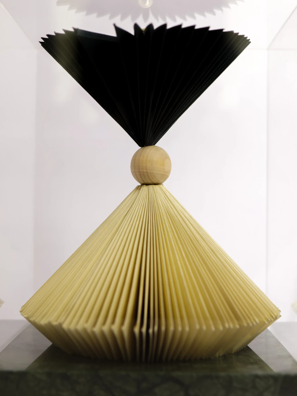 Escultura composta por duas formas cônicas de papel dobrado, unidas por uma esfera central em madeira clara. A parte superior possui coloração escura e a inferior, tom bege. O conjunto está protegido por caixa de acrílico sobre base verde marmorizada.