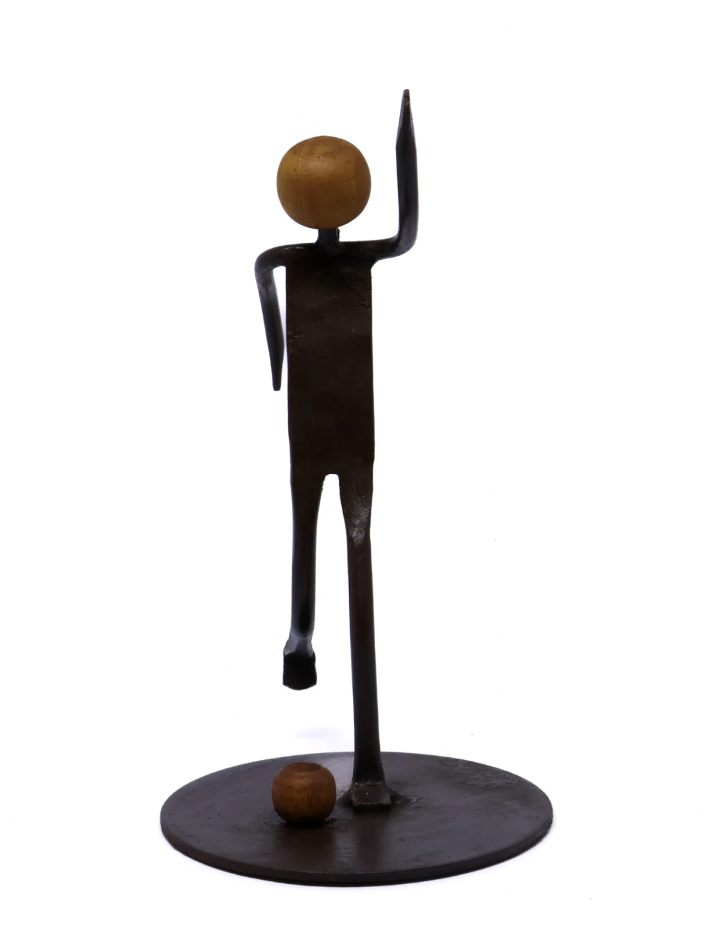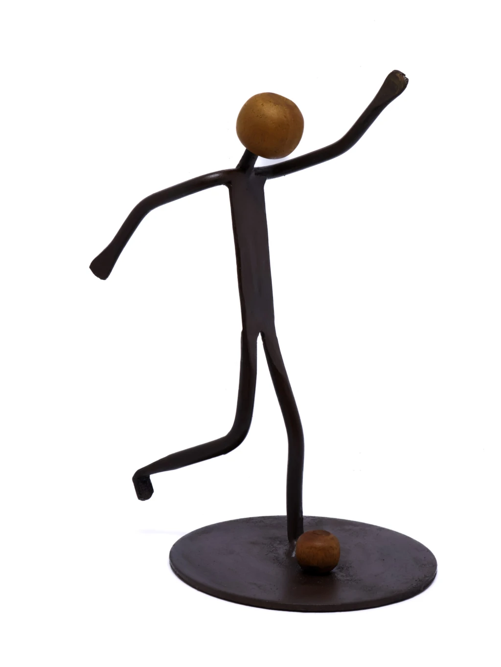 Escultura artesanal em ferro envelhecido e madeira envernizada, retratando uma figura em movimento no ato de chutar a bola. As linhas longas e o acabamento rústico reforçam a sensação de dinamismo e expressividade, destacando o caráter artístico e contemporâneo da peça. Ideal para ambientes que valorizam o design manual e elementos com presença escultórica.
