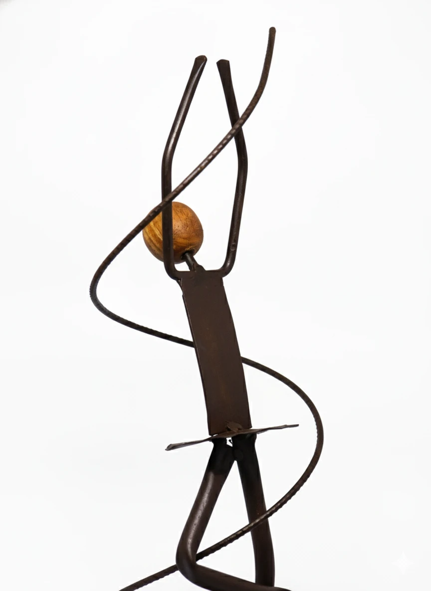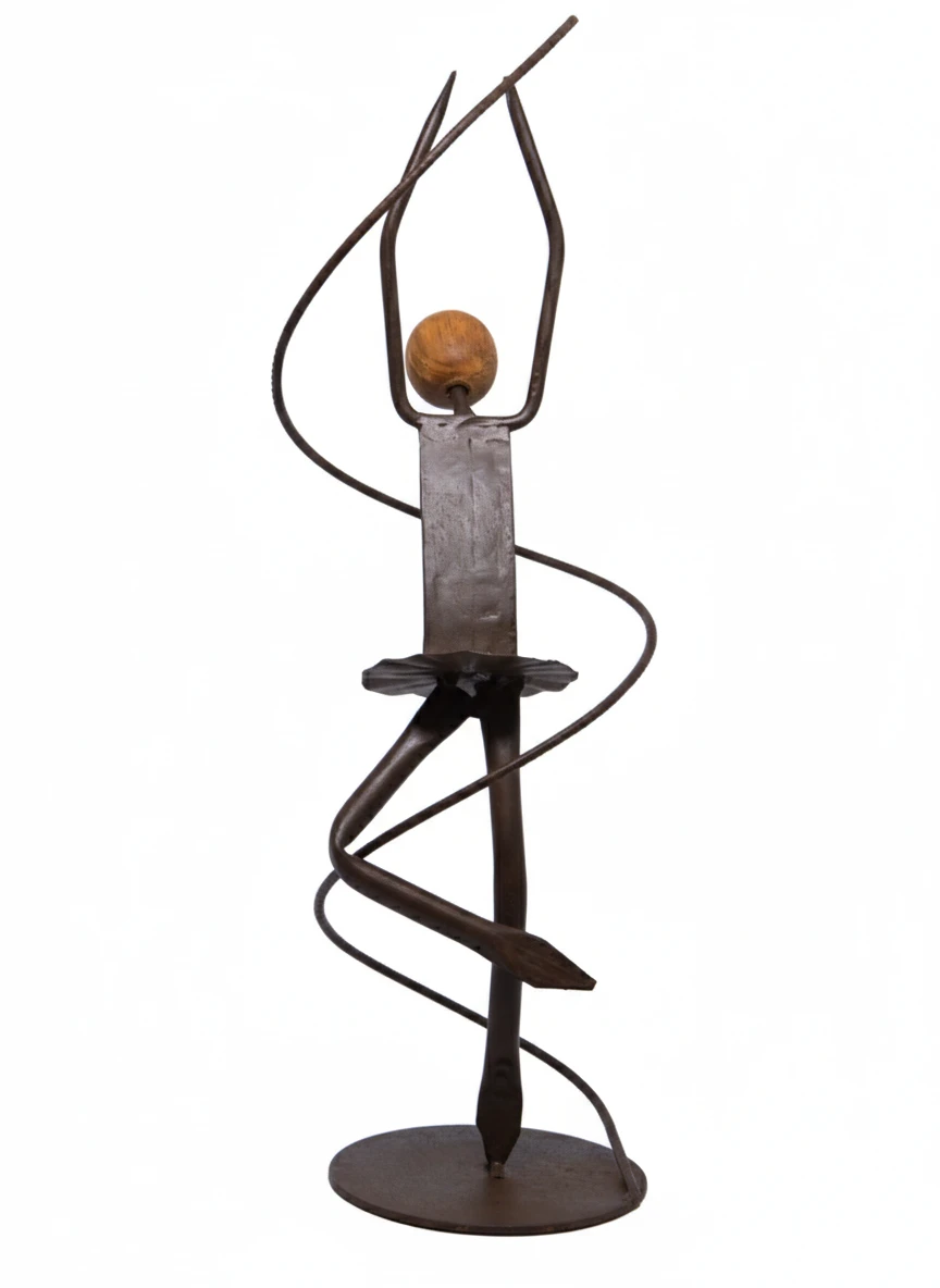 Escultura artesanal em ferro envelhecido e madeira envernizada, retratando uma bailarina. As linhas longas e o acabamento rústico reforçam a sensação de dinamismo e expressividade, destacando o caráter artístico e contemporâneo da peça. Ideal para ambientes que valorizam o design manual e elementos com presença escultórica.