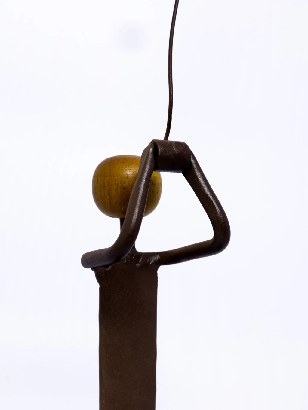 Escultura artesanal em ferro envelhecido e madeira envernizada, retratando uma criança com uma pipa. As linhas longas e o acabamento rústico reforçam a sensação de dinamismo e expressividade, destacando o caráter artístico e contemporâneo da peça. Ideal para ambientes que valorizam o design manual e elementos com presença escultórica.