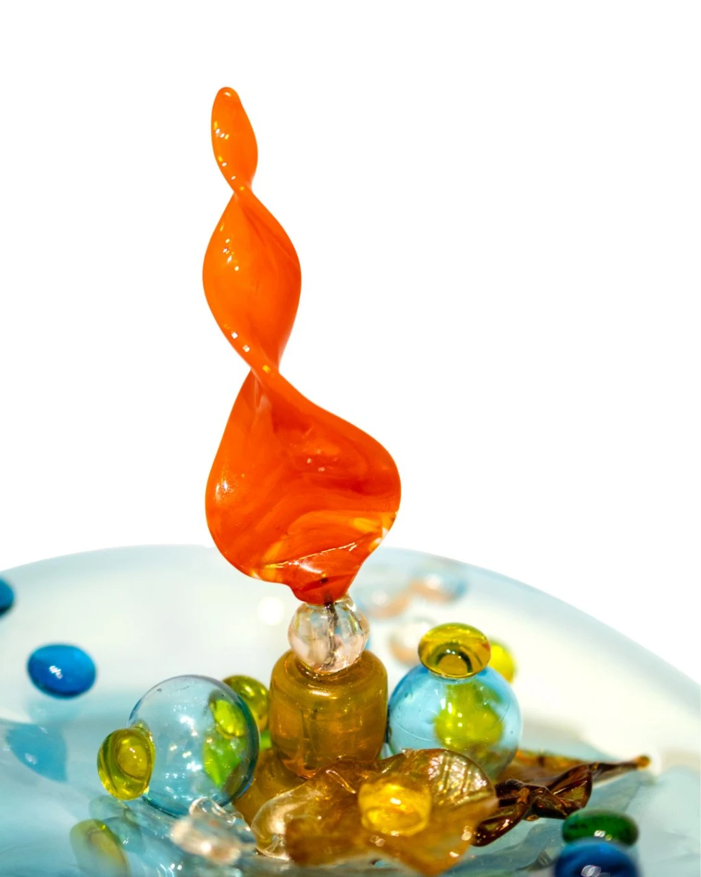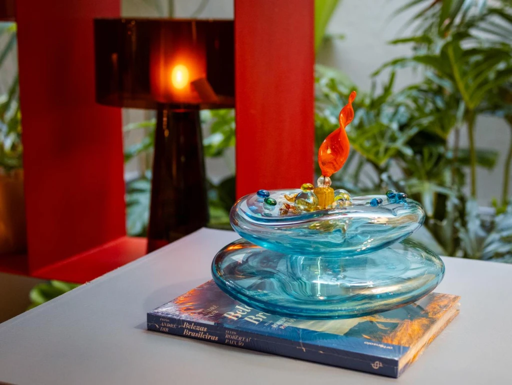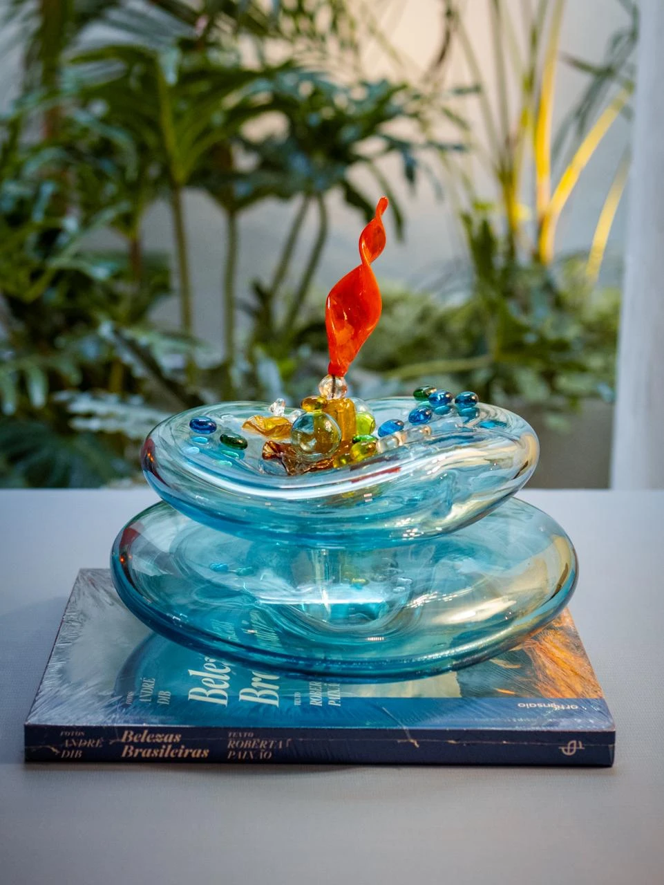 Escultura em cristal soprado da série De Tudo e Mais um Pouco. Combina cores e formas orgânicas em composição lúdica que une leveza e expressão escultórica.
