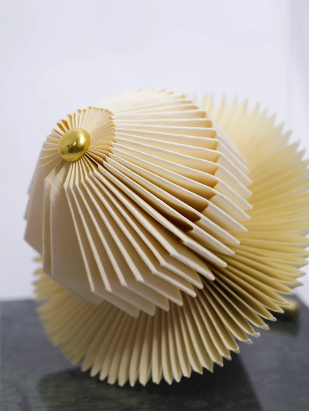 Escultura em papel com base em mármore verde, estrutura metálica e caixa acrílica. A composição apresenta formas orgânicas e movimento espiralado, explorando ritmo e equilíbrio entre leveza e densidade. Ideal para apoio em mesas e aparadores.