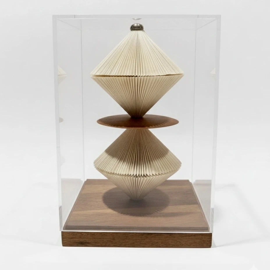 Escultura em papel plissado off white com dois elementos em formato de balão sobrepostos, separados por disco de metal bronze. Finalizada com esfera metálica no topo. Base de madeira e caixa acrílica de proteção.