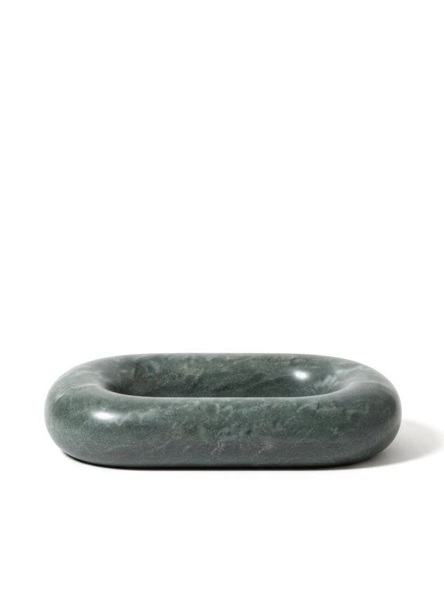 Escultura em mármore Persian Green com forma oval contínua. As bordas arredondadas e o acabamento polido evidenciam o movimento fluido da pedra, destacando variações naturais do verde. A peça combina solidez e leveza visual, podendo ser exposta como elemento decorativo de mesa ou aparador.