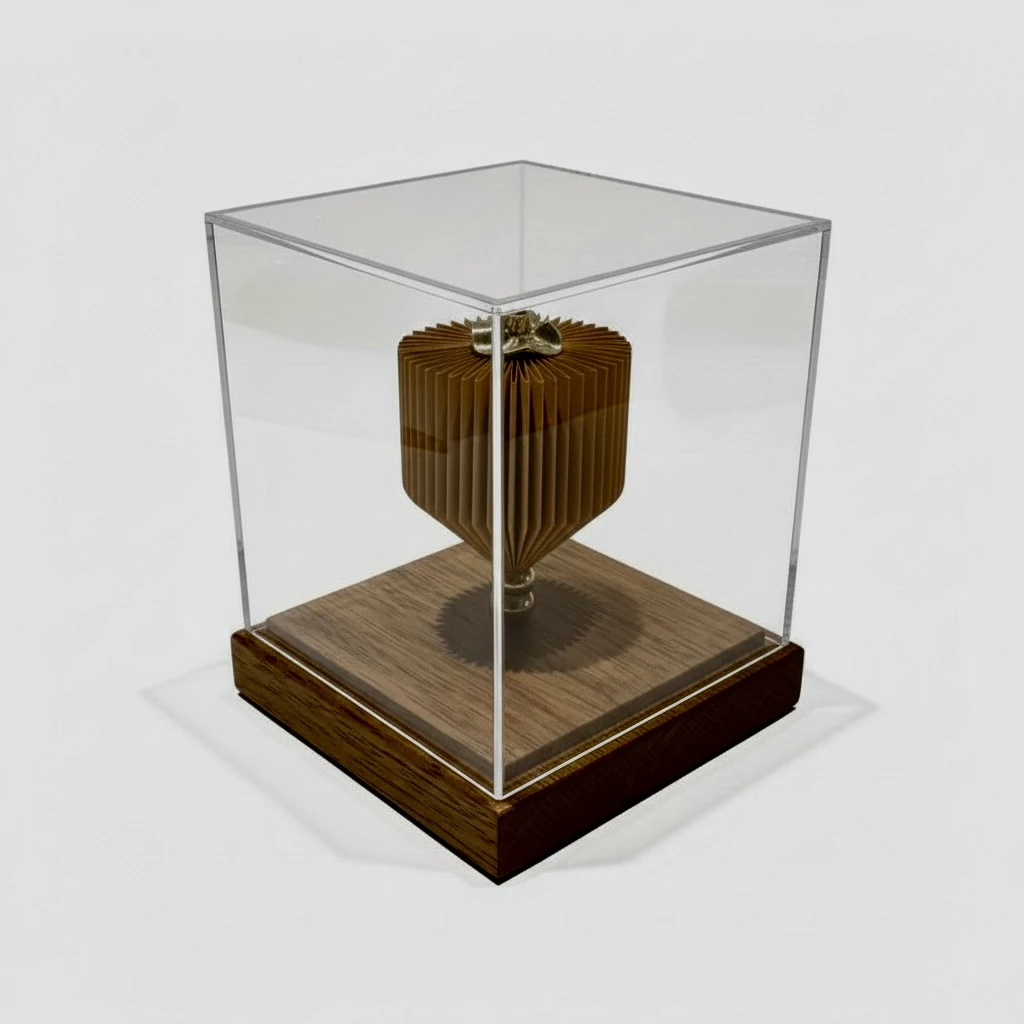 Escultura em papel plissado ocre em formato geométrico de balão, finalizada com flor decorativa em metal dourado no topo. Base em madeira maciça.