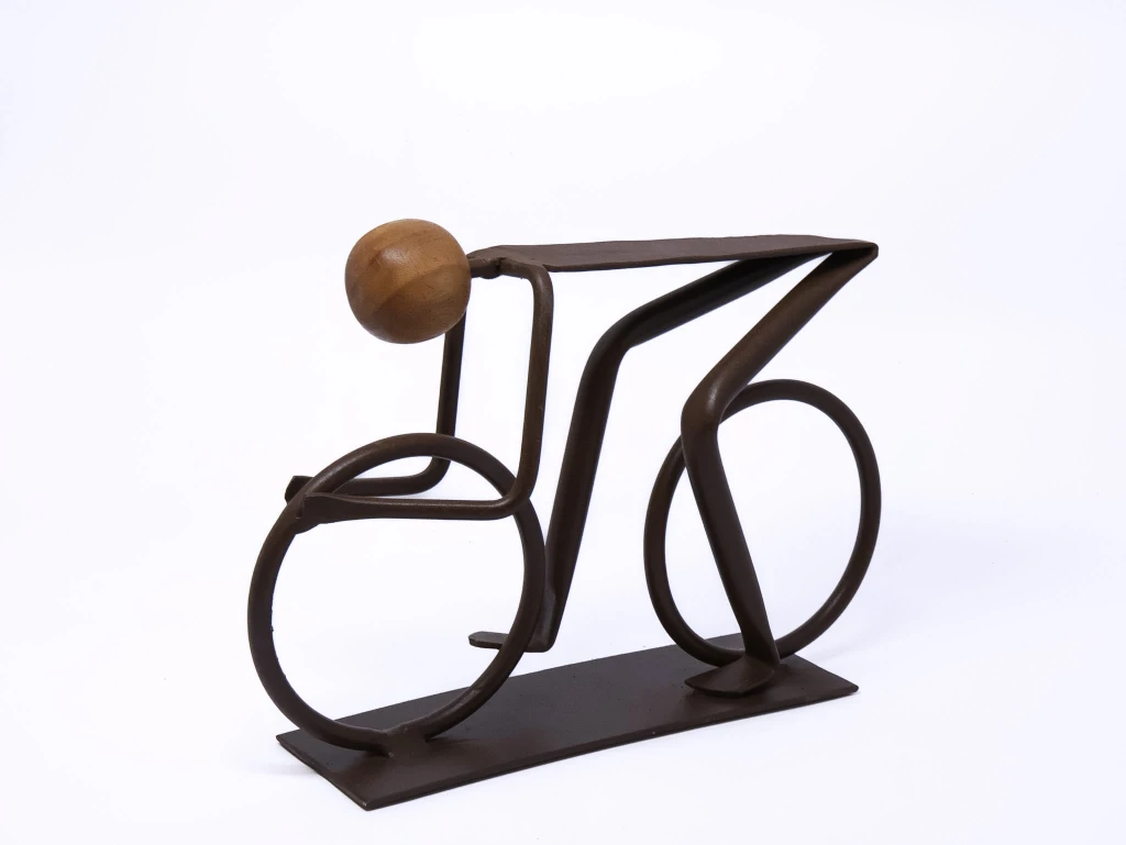 Escultura artesanal em ferro envelhecido e madeira envernizada, representando um ciclista em movimento. O design minimalista e as linhas curvas evidenciam o dinamismo da cena, transmitindo leveza e fluidez. A combinação dos materiais naturais com o acabamento rústico reforça o caráter artístico e atemporal da peça, perfeita para compor ambientes modernos ou com toque industrial.