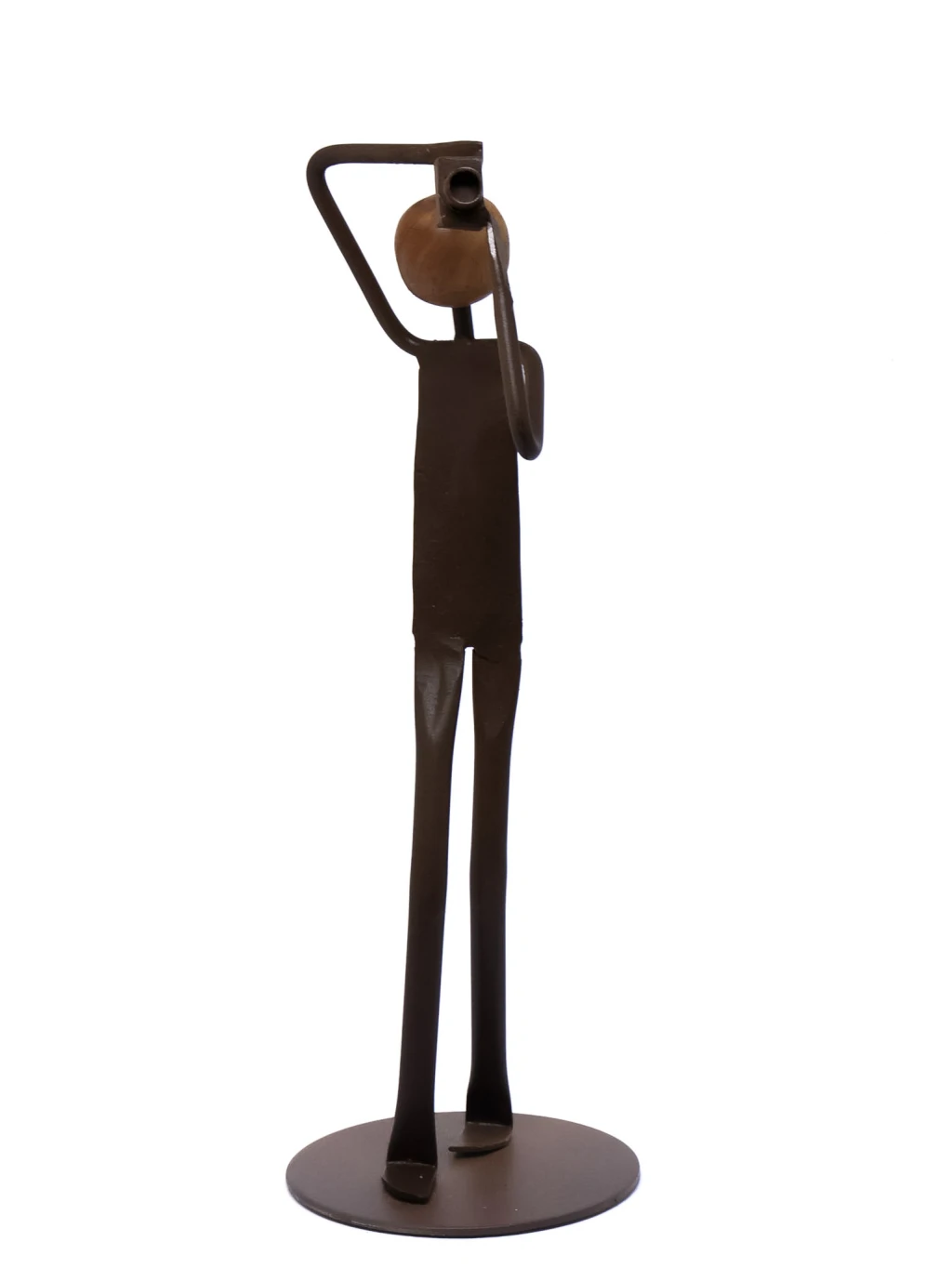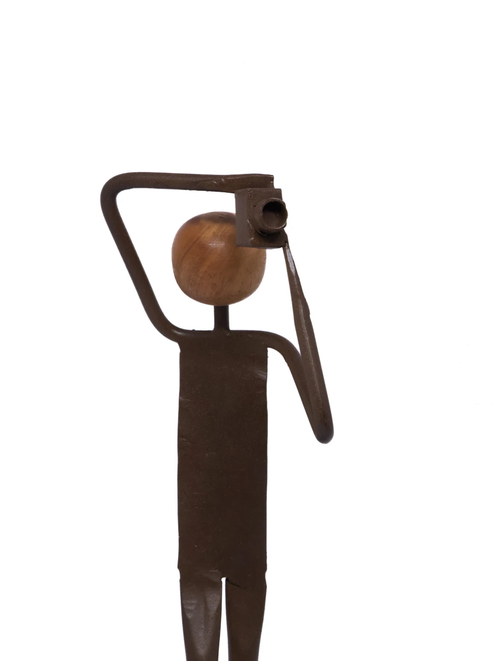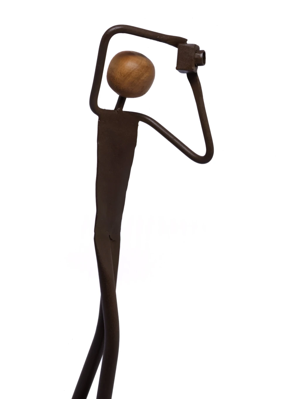 Escultura artesanal em ferro envelhecido e madeira envernizada, retratando uma figura com câmera em mãos, no gesto de fotografar. As linhas alongadas e o acabamento rústico destacam o movimento e a expressão criativa da peça, que combina arte e leveza em um formato contemporâneo. Ideal para ambientes que valorizam o design manual e o universo da fotografia.