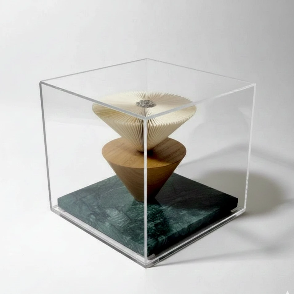 Escultura em papel plissado bege com elemento cônico de madeira. Base de mármore Guatemala e caixa acrílica de proteção.