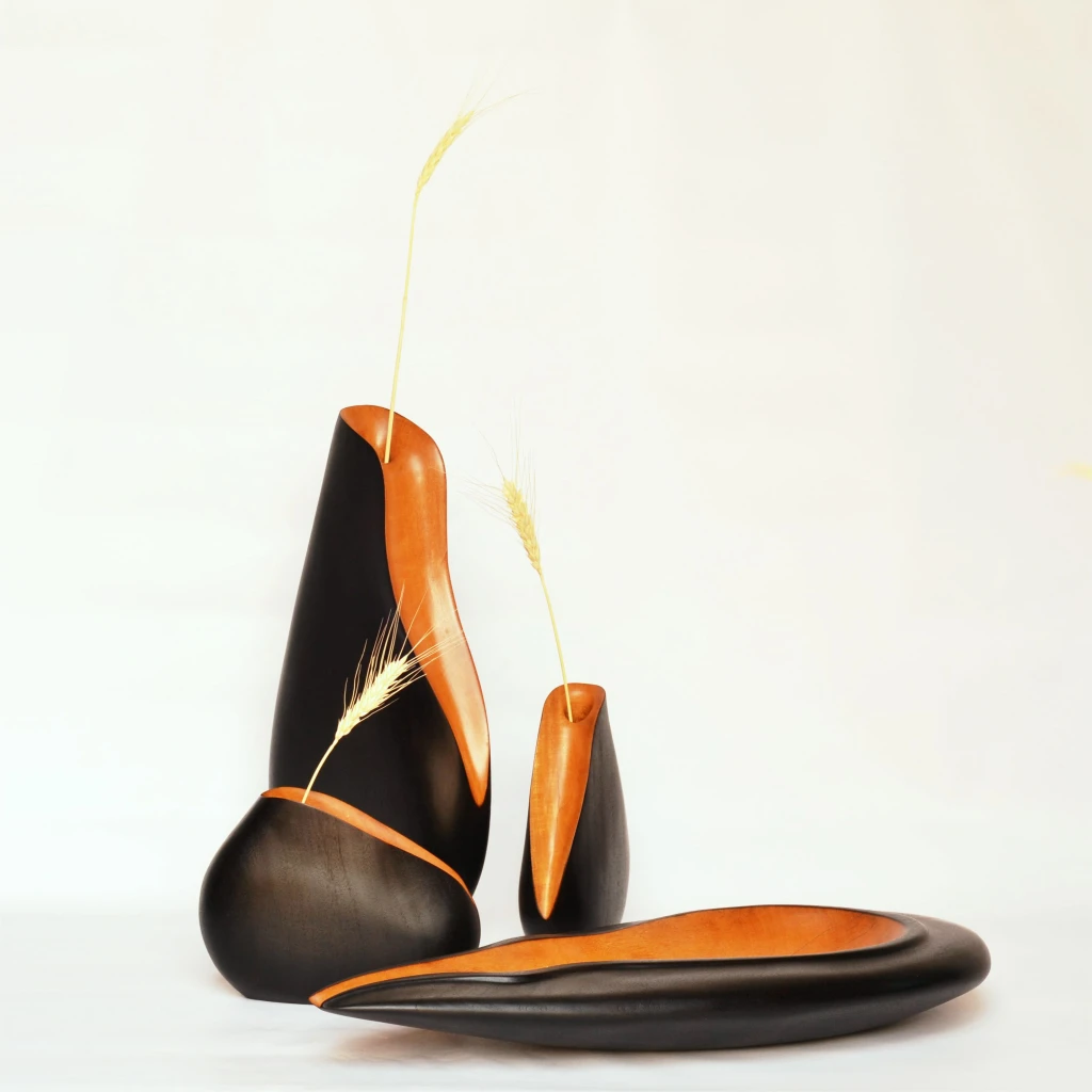 Suas curvas evocam a casca espessa e protetora do Jatobá, enquanto o contraste entre tons claros e escuros revela a dualidade entre resistência e suavidade. Esculpida manualmente em madeira Garapa, a obra recebe acabamento com a técnica Shou Sugi Ban, método japonês de queima que confere textura profunda, proteção natural e intensidade visual — sem pigmentos, apenas o fogo como agente de transformação.