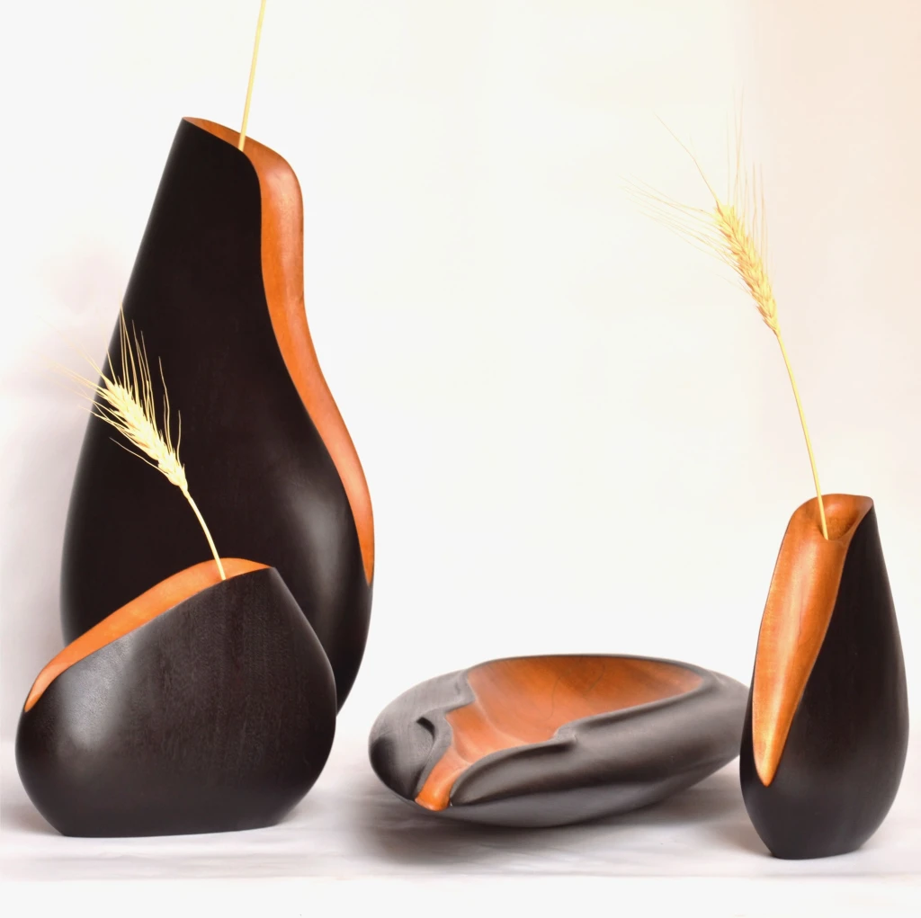 Suas curvas evocam a casca espessa e protetora do Jatobá, enquanto o contraste entre tons claros e escuros revela a dualidade entre resistência e suavidade. Esculpida manualmente em madeira Garapa, a obra recebe acabamento com a técnica Shou Sugi Ban, método japonês de queima que confere textura profunda, proteção natural e intensidade visual — sem pigmentos, apenas o fogo como agente de transformação.