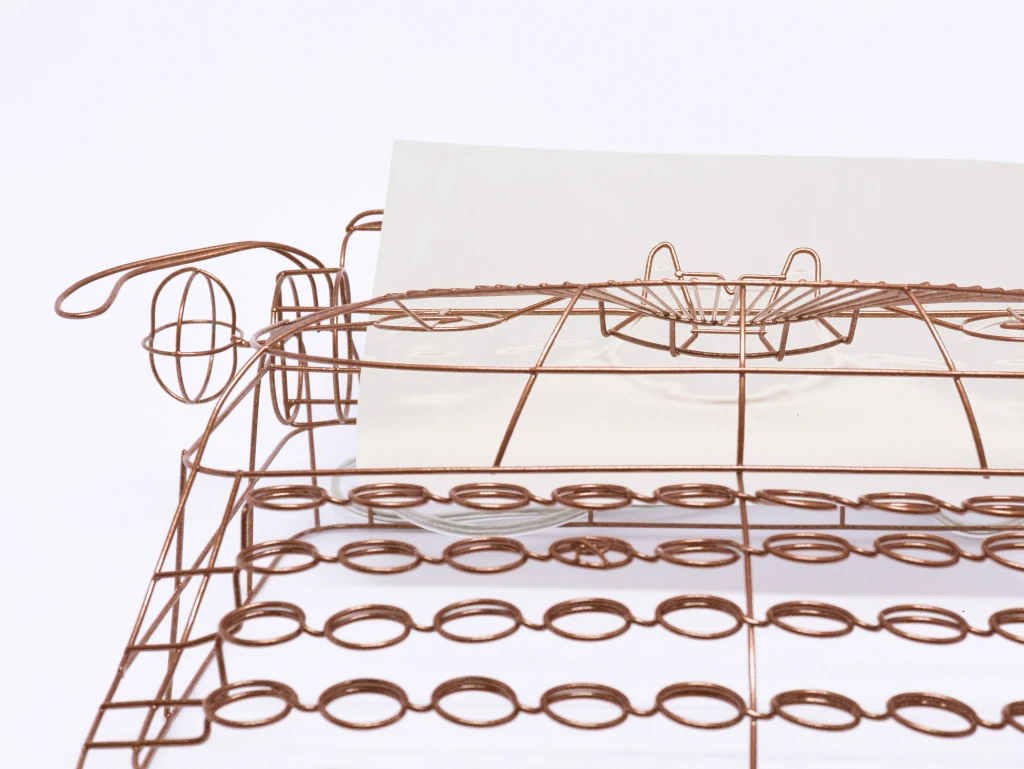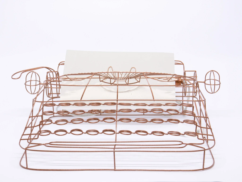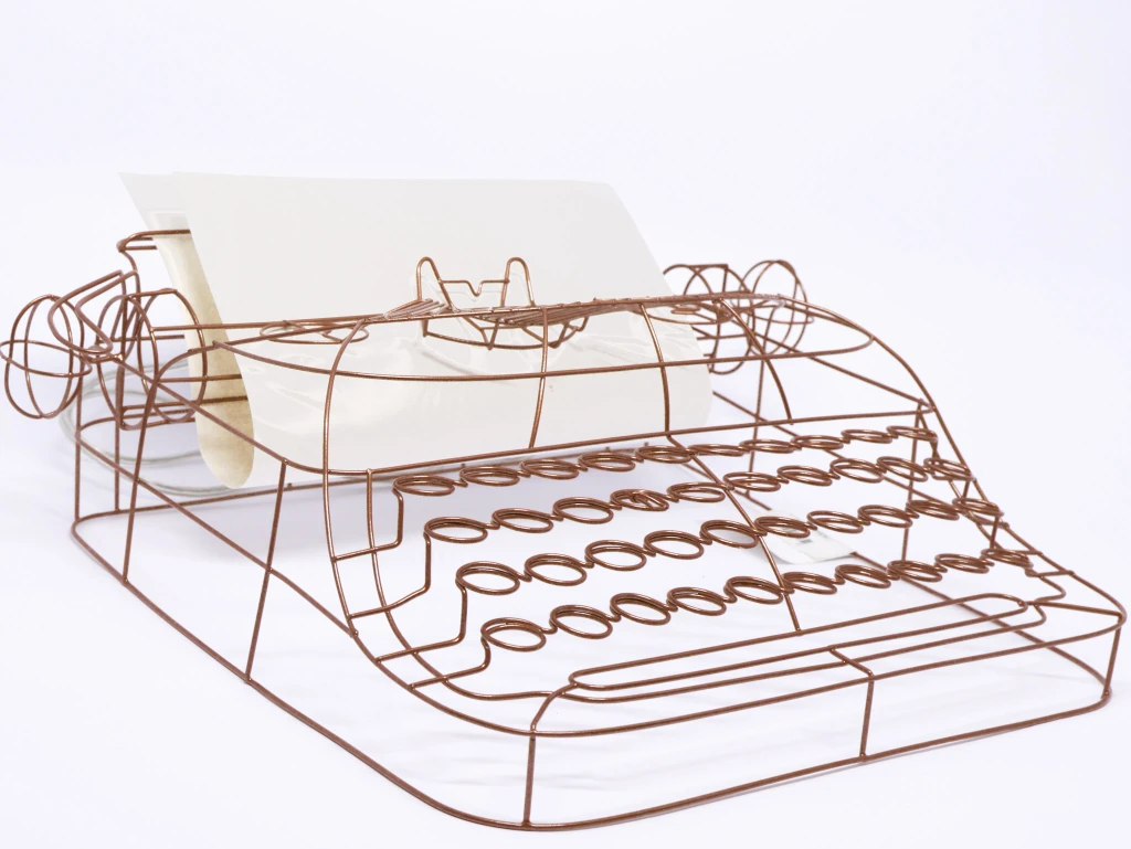 Escultura luminosa em arame no formato de máquina de escrever. A estrutura metálica reproduz o desenho do objeto em linhas delicadas, enquanto a luz se projeta sobre o papel, destacando-o como ponto central da obra. A peça combina design minimalista e referência nostálgica à escrita, transformando um instrumento clássico em objeto de iluminação.