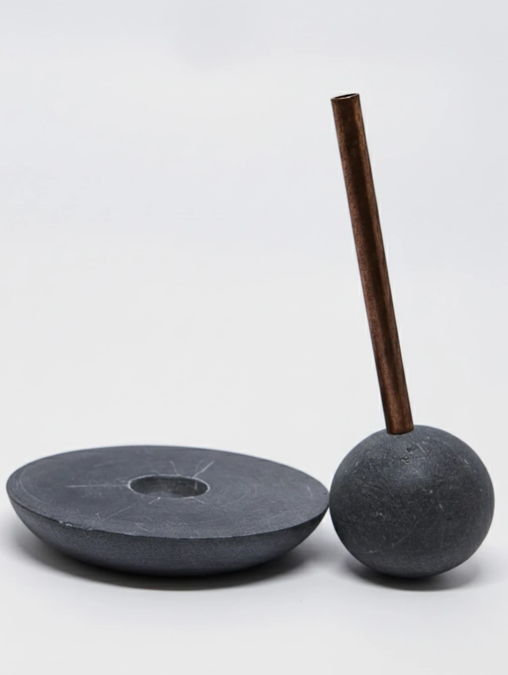 Objeto escultural artesanal que celebra o contraste: a solidez da pedra-sabão encontra a leveza e verticalidade do cobre. Uma composição elegante de formas puras. Por ser feito em pedra natural, cada exemplar é único e pode apresentar variações de tonalidade.