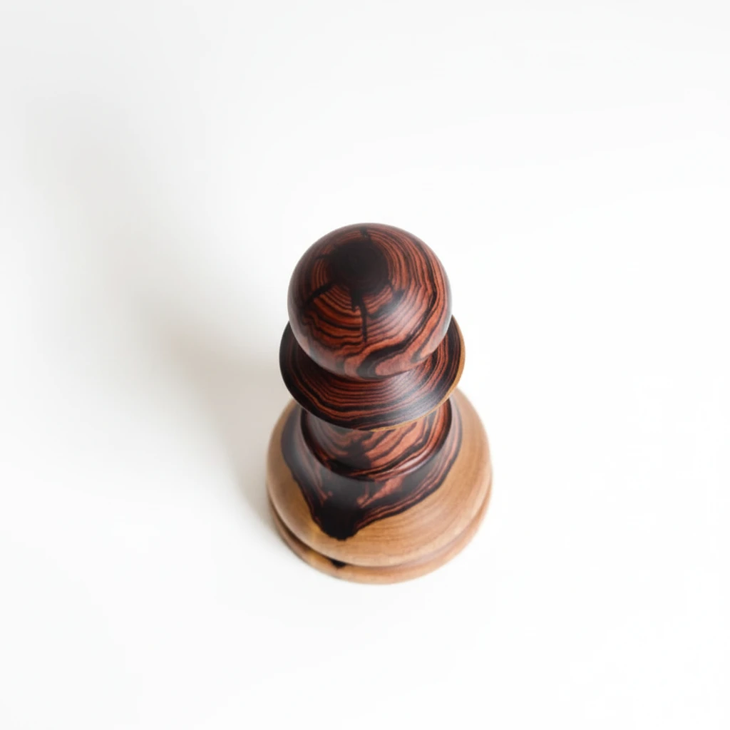 Peça de xadrez (peão) produzida artesanalmente em Jacarandá Violeta, madeira nobre brasileira com veios marcantes em tons de marrom, laranja avermelhado e base em tom claro.