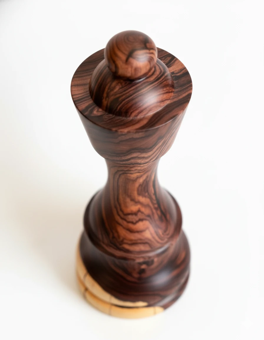 Peça de xadrez (rainha) produzida artesanalmente em Jacarandá Violeta, madeira nobre brasileira com veios marcantes em tons de marrom, laranja avermelhado e base em tom claro.