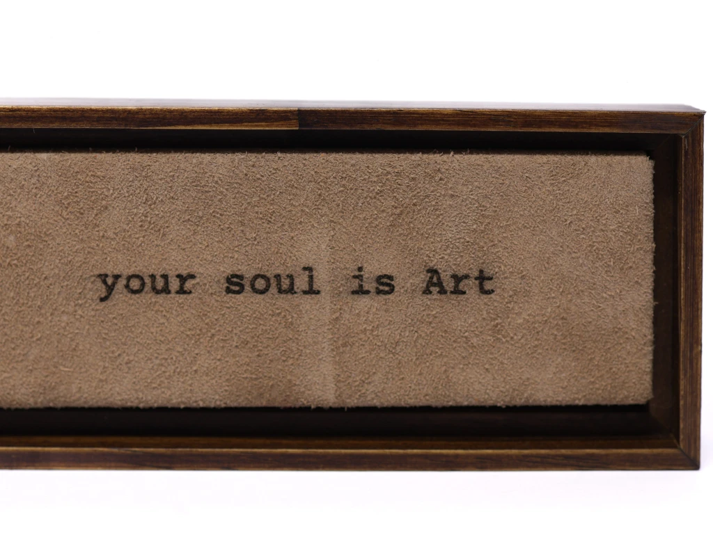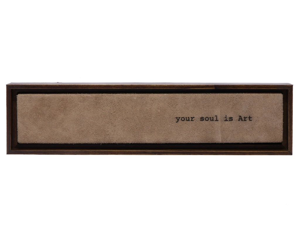 Quadro confeccionado em madeira freijó, com régua revestida em couro/camurça. A combinação dos materiais ressalta textura e acabamento natural, criando uma peça elegante e versátil para diferentes composições.