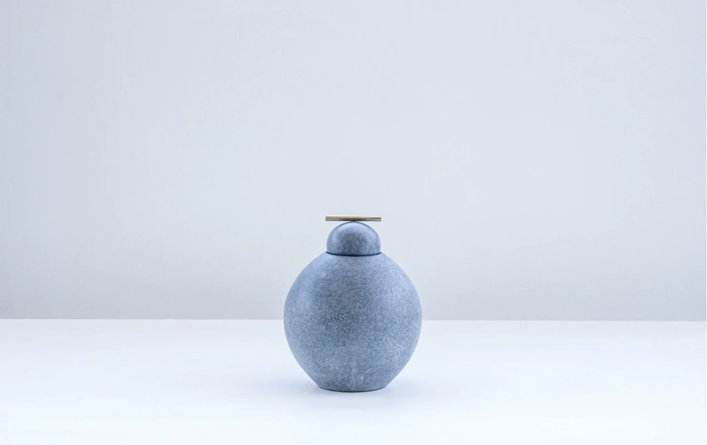 Vaso esculpido em pedra-sabão, com design geométrico que valoriza a união entre linhas simples e proporções equilibradas. A rocha natural apresenta variações de tonalidade que vão do rosado ao acinzentado, tornando cada peça única. Produzido artesanalmente, o vaso destaca a textura e o brilho sutil do material, revelando o encontro entre forma, matéria e movimento.