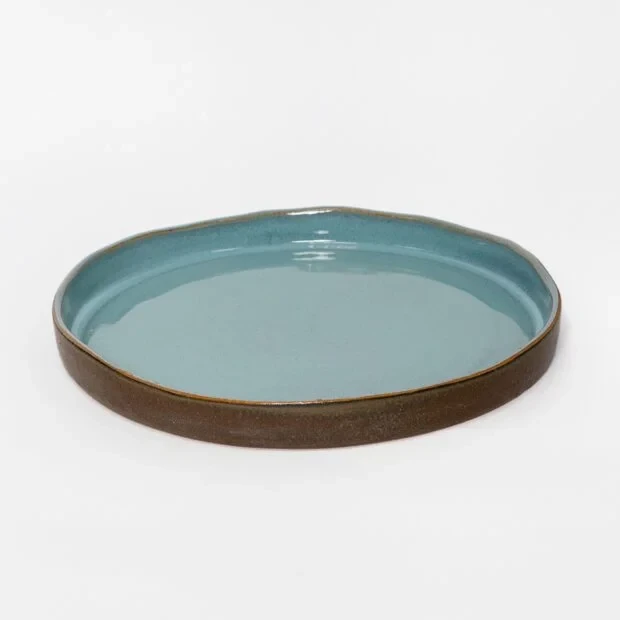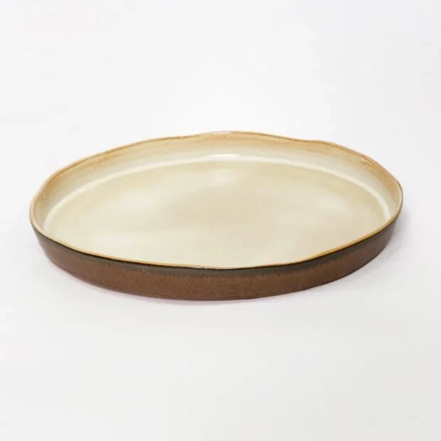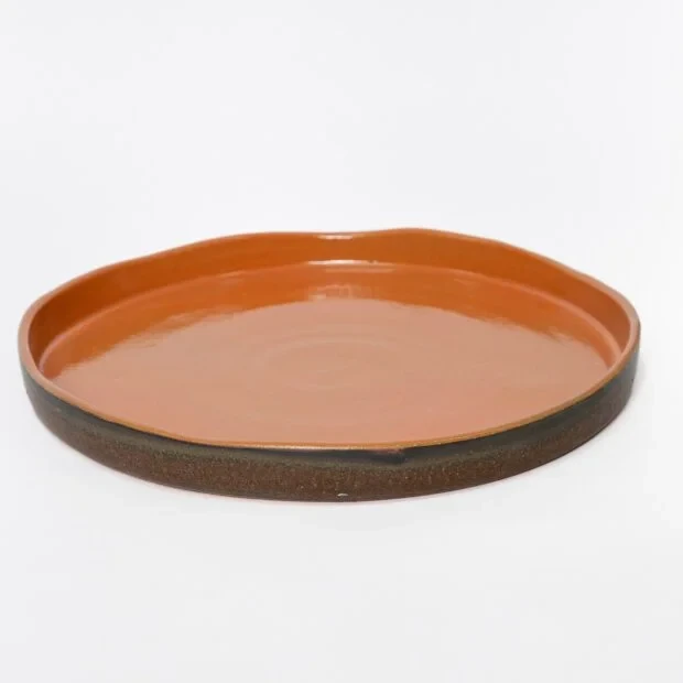 Prato de aperitivo em cerâmica esmaltada com design minimalista. O acabamento artesanal revela a argila natural nas bordas, criando contraste com o esmalte do interior. Ideal para servir petiscos, entradas ou como peça decorativa.