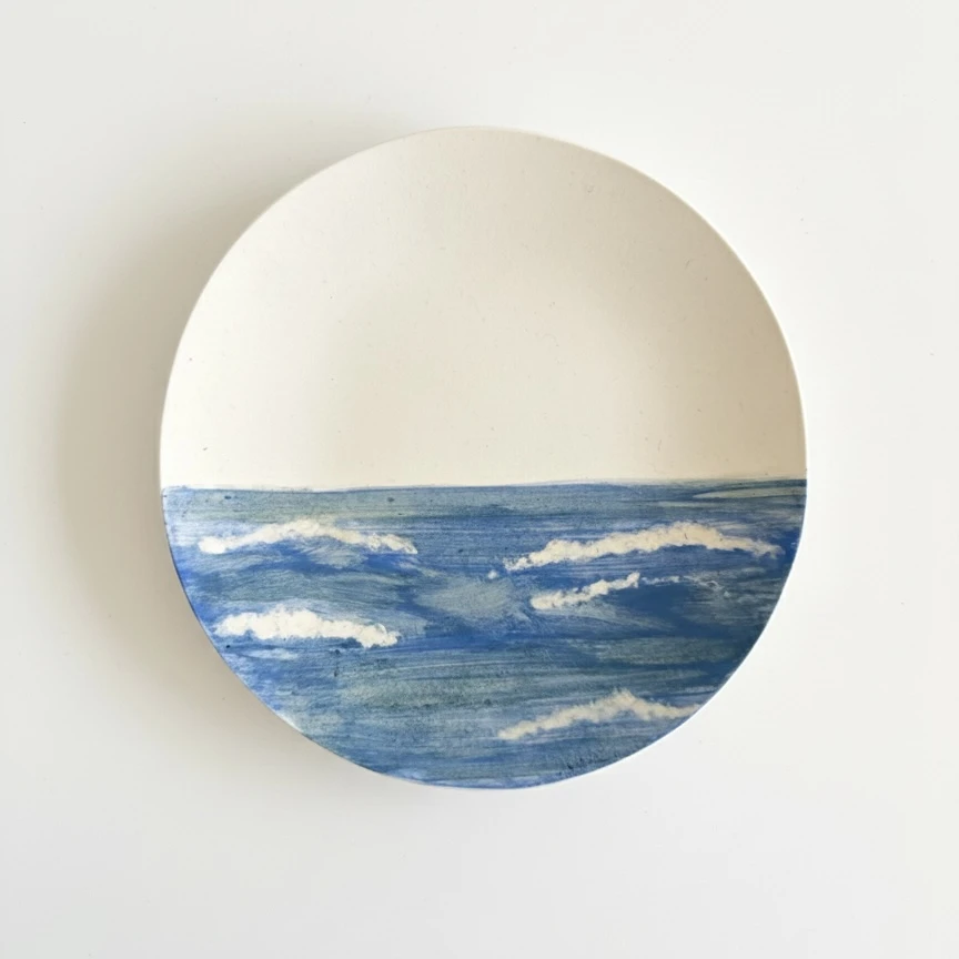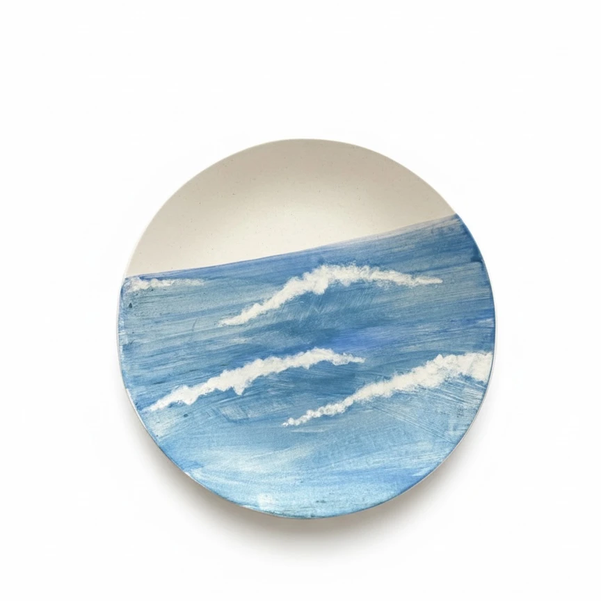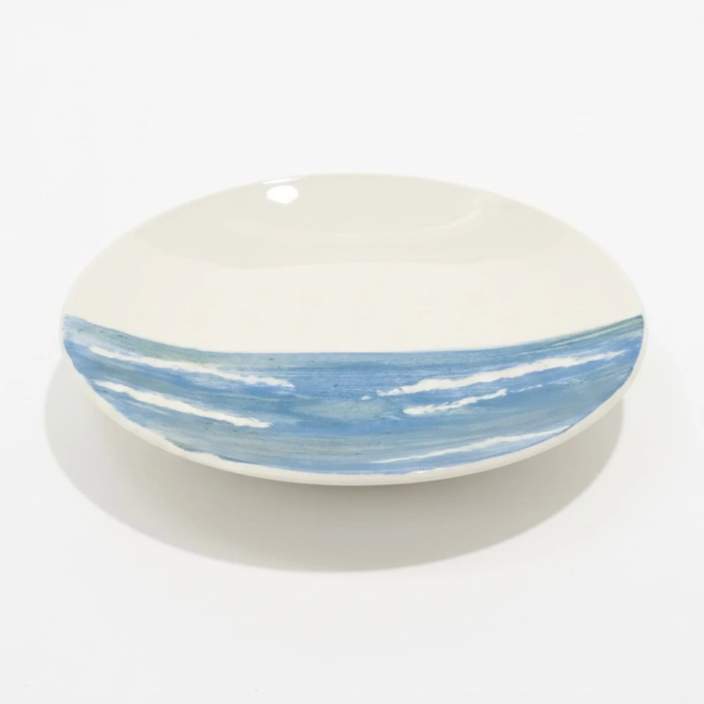Prato em porcelana pintado à mão com padrão de ondas em tons de azul e branco. A técnica artesanal preserva o traço espontâneo das pinceladas, criando uma composição orgânica que remete ao movimento do mar. Funciona como peça decorativa ou utilitária, podendo ser utilizado em mesas ou exposto na parede. Disponível em dois tamanhos: P (18 x 4 x 18 cm) e G (24 x 4 x 24 cm). Por se tratar de um trabalho artesanal pintado à mão, cada peça possui sua própria identidade e pequenas variações entre o modelo recebido e as imagens apresentadas.