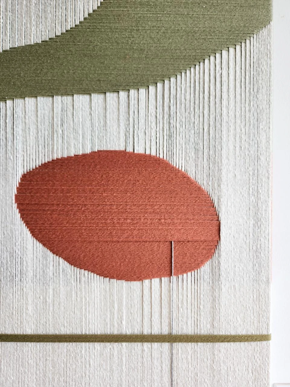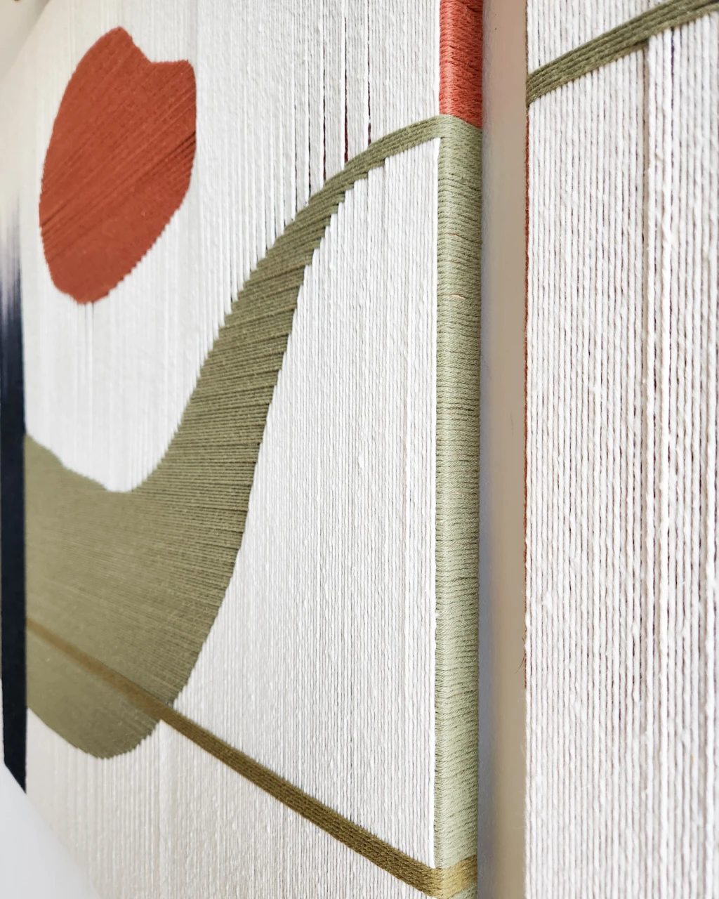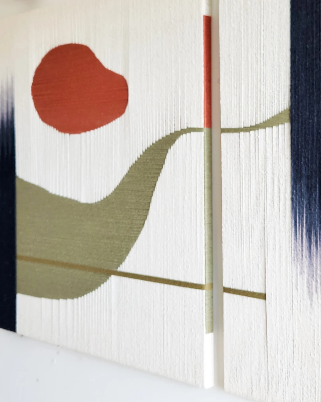 Obra têxtil, composta por tramado tensionado com juta natural e barbantes de algodão sobre chassi de madeira. O tingimento natural, obtido com cascas de catuaba, confere à peça nuances terrosas e variações sutis de cor que reforçam sua organicidade. A composição equilibra linhas geométricas e texturas naturais, criando uma atmosfera de calma e profundidade.