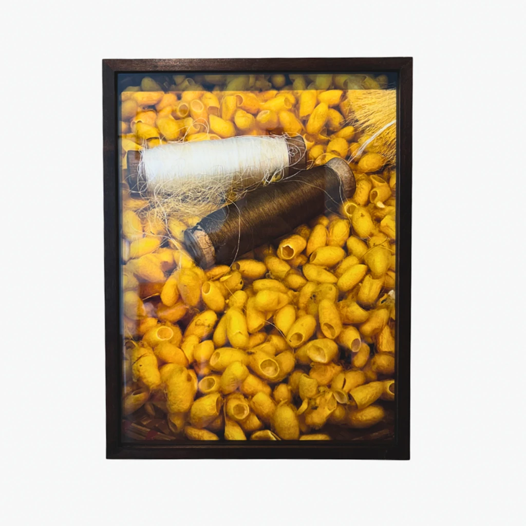Registro fotográfico capturado no Caminho do Rio Mekong, Vietnã, onde os pequenos casulos são feitos de um fio único e contínuo de seda que mede entre 300 e 900 metros de comprimento.