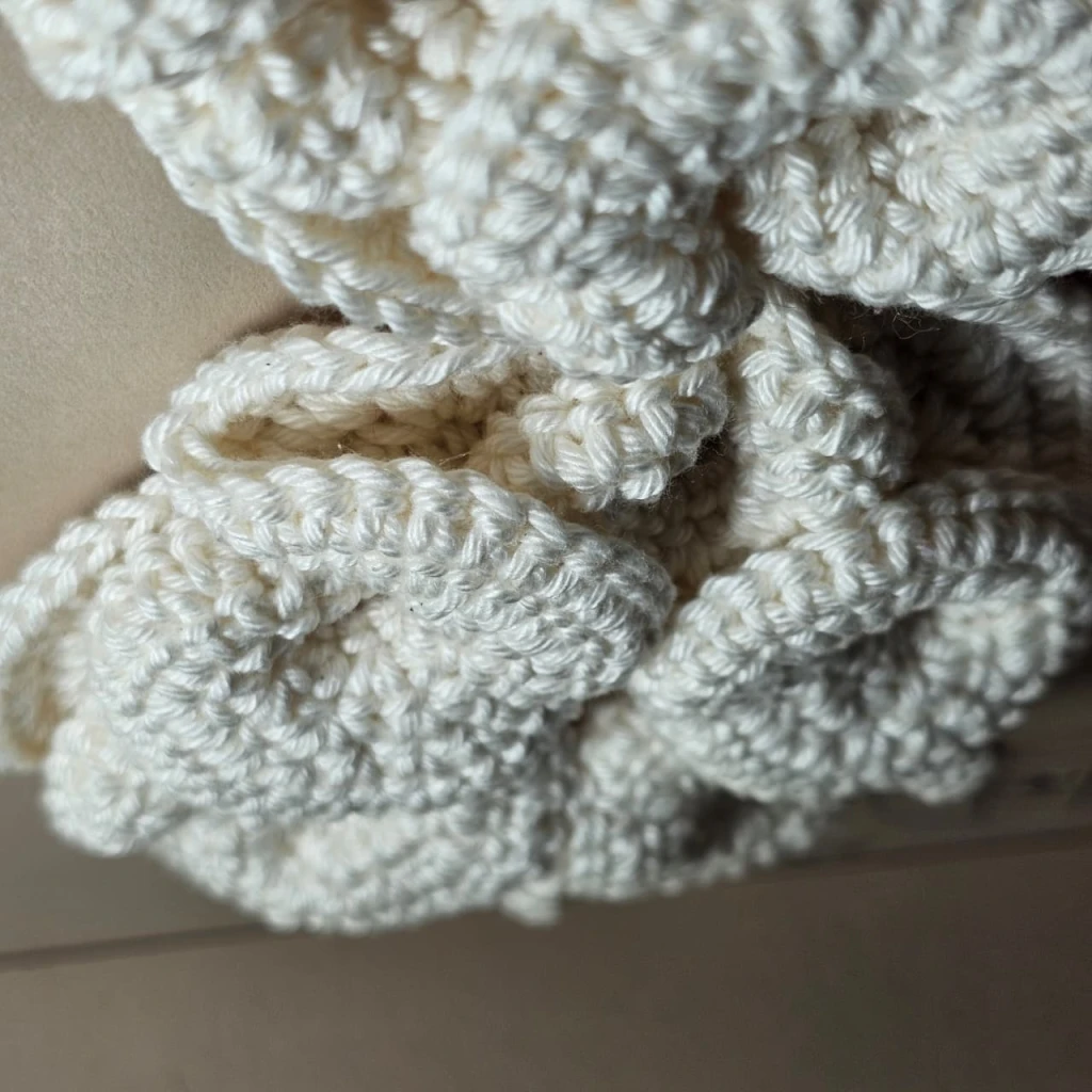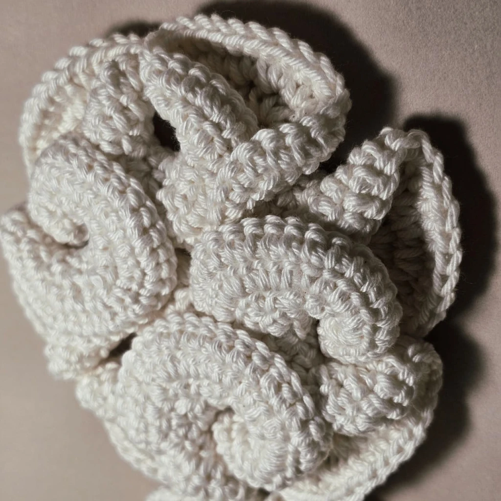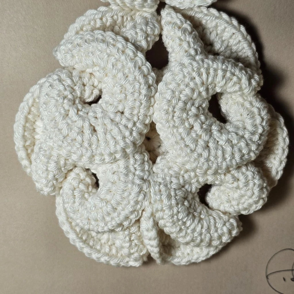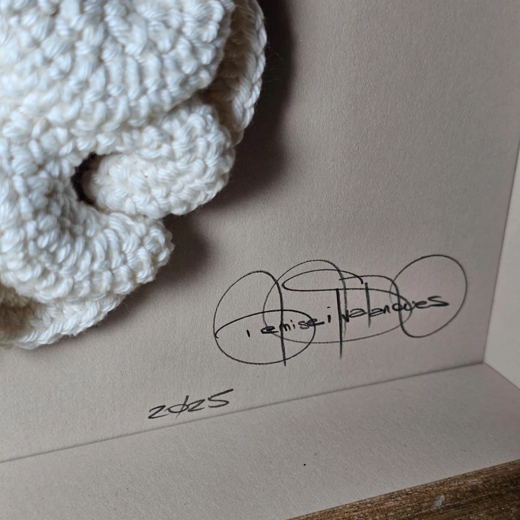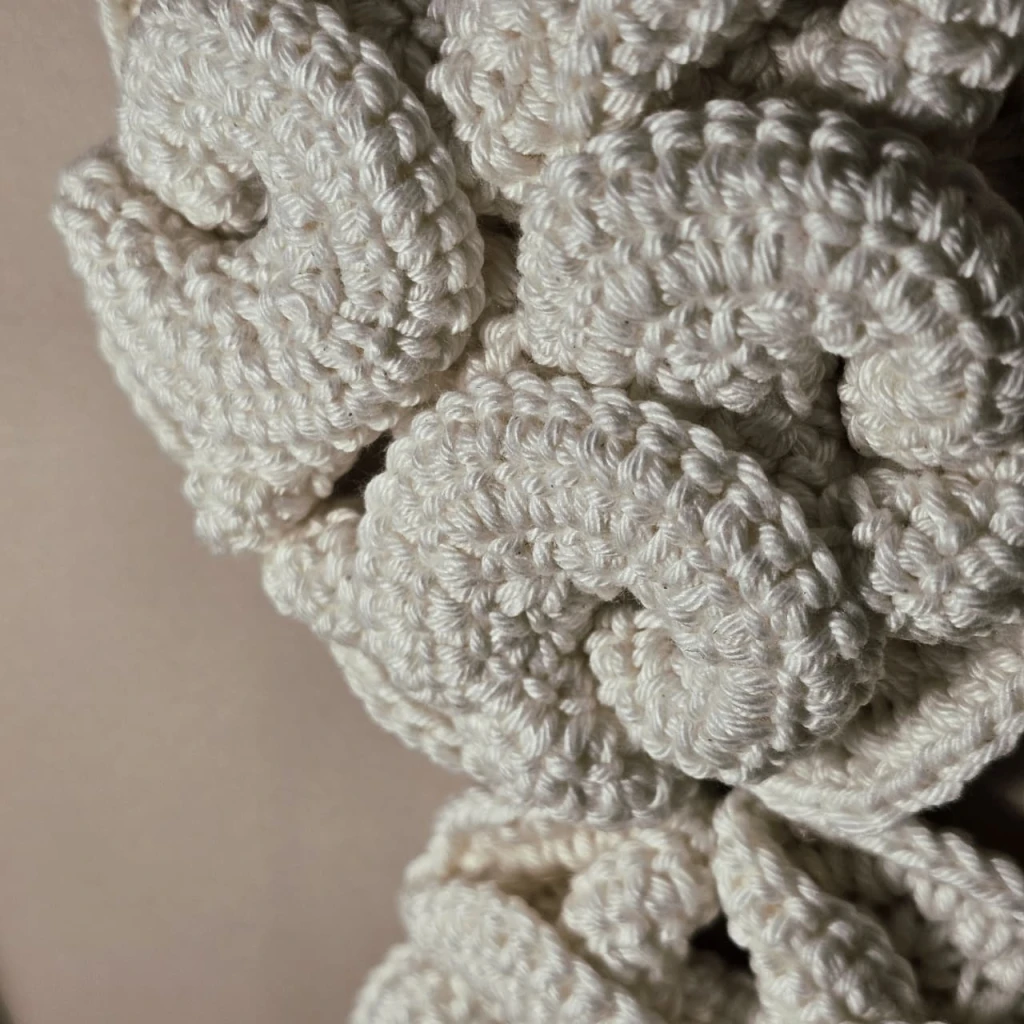 Na coleção Hiperbólicos, o crochê se torna um meio de investigação entre arte, natureza e matemática. As formas surgem a partir da repetição paciente do gesto manual, criando estruturas orgânicas e fractais que se expandem, se dobram e se voltam sobre si mesmas. São corpos têxteis que parecem crescer vivos, como corais do fundo do mar ou organismos microscópicos em constante mutação.