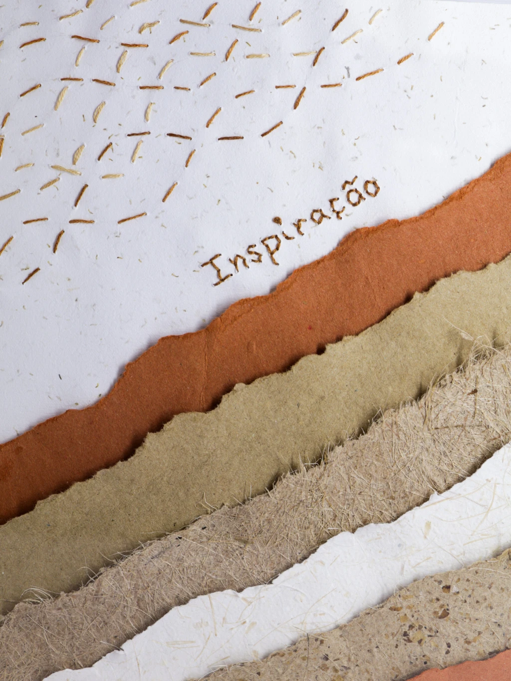 Inspiração é uma celebração da leveza e do movimento interior. As camadas de papéis artesanais revelam tons terrosos e texturas naturais que evocam calma e presença. Cada faixa sobreposta reflete o ritmo orgânico da criação e o gesto delicado do bordado manual, que traz no centro a palavra “Inspiração”, símbolo do sopro criativo que guia o cotidiano.