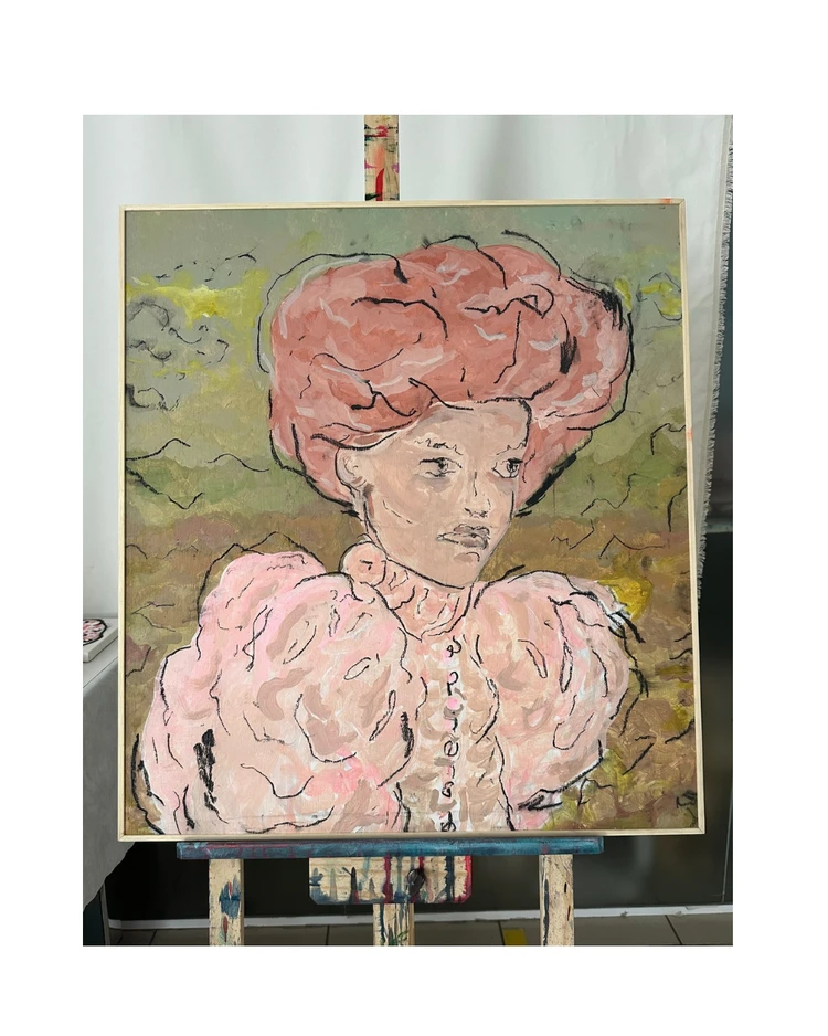 Acrílica e carvão sobre madeira e moldura em madeira clara.