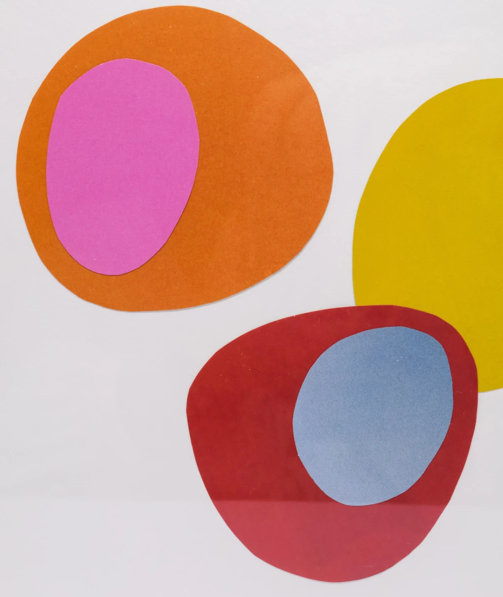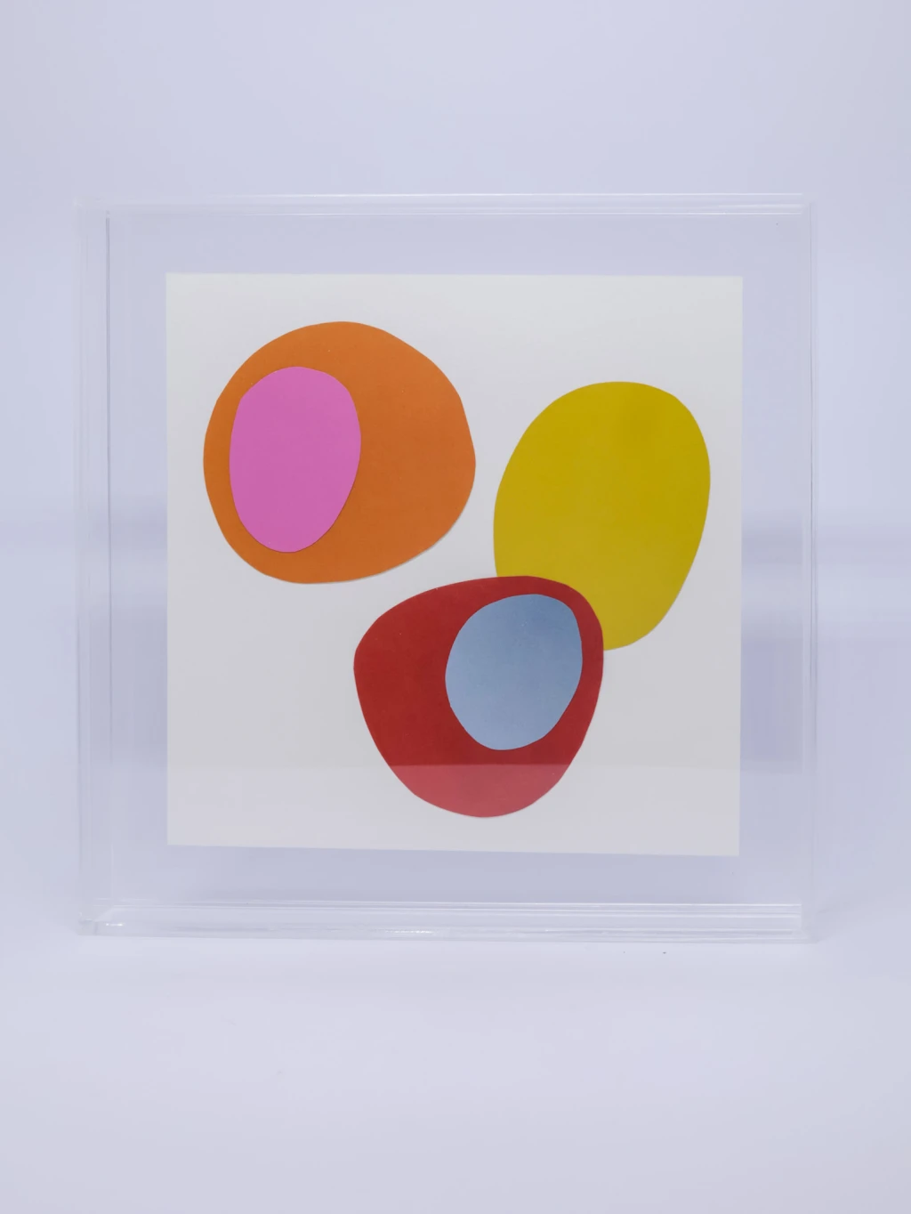 Papel recortado em cores sobre fundo branco, apresentado em caixa de acrílico transparente. Objeto decorativo com composição geométrica simples.