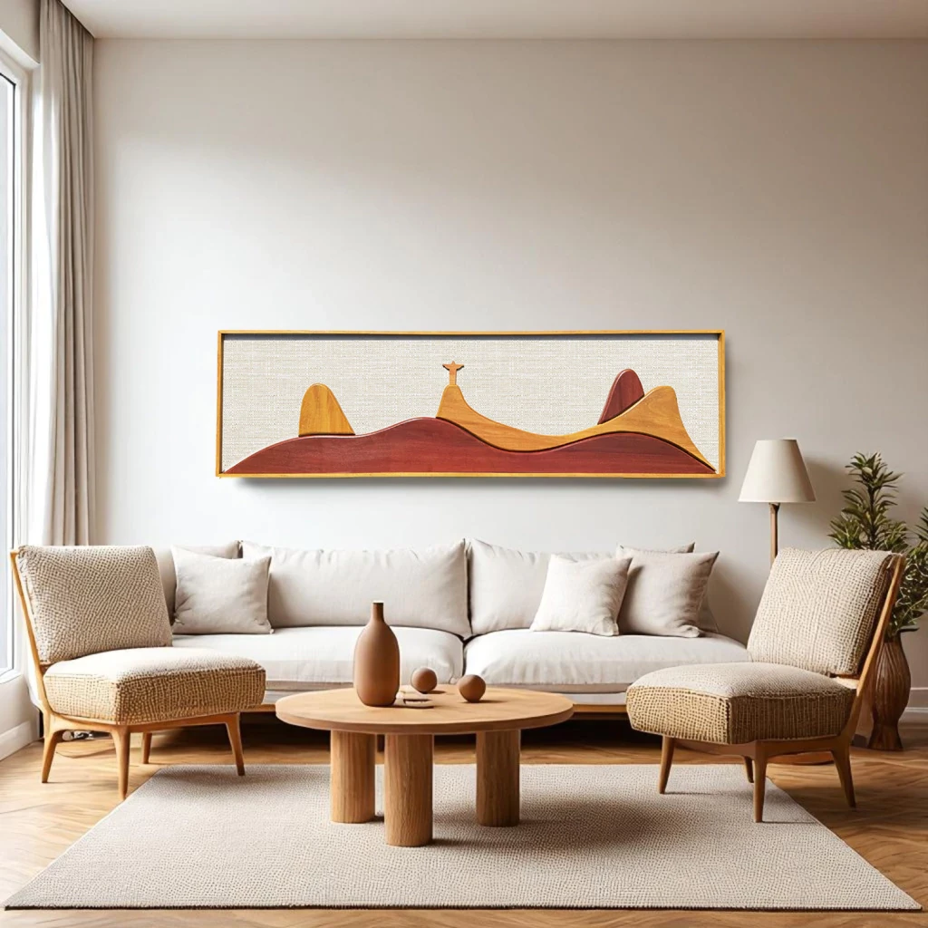 Inspirado na paisagem única da Cidade Maravilhosa, a obra representa os icônicos morros do Rio. Minimalista e sofisticado, é perfeito para compor ambientes modernos, rústicos ou afetivos, trazendo um toque de brasilidade e natureza para a decoração. Uma obra que celebra o design autoral e a beleza atemporal da geografia carioca.