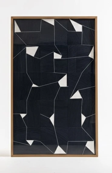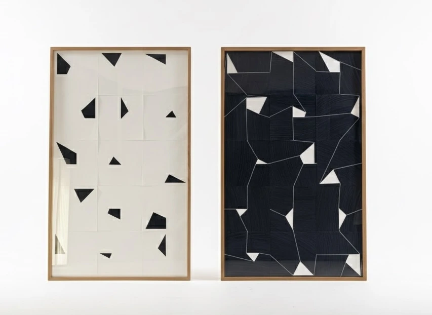 Composição abstrata minimalista que apresenta triângulos brancos distribuídos sobre fundo azul-petróleo profundo. Os elementos geométricos se dispersam de maneira aparentemente aleatória pela superfície, criando um ritmo visual que oscila entre ordem e casualidade.