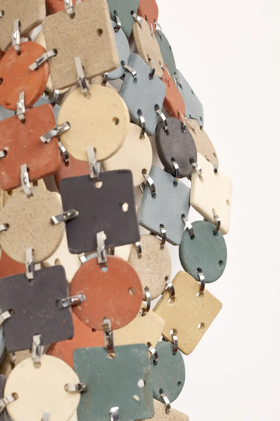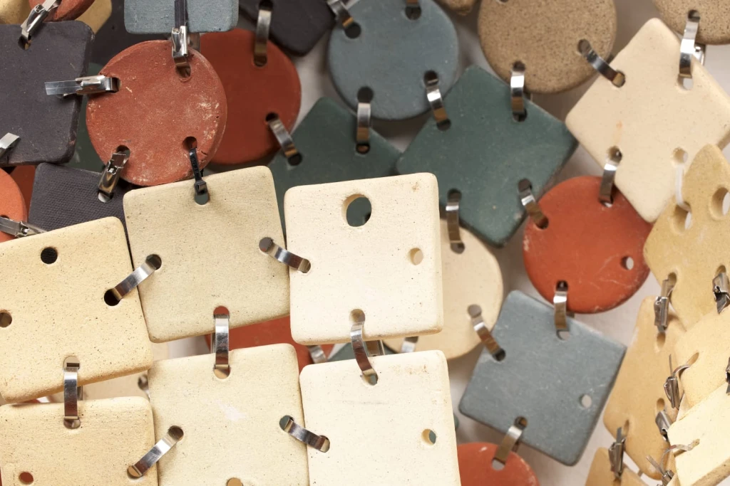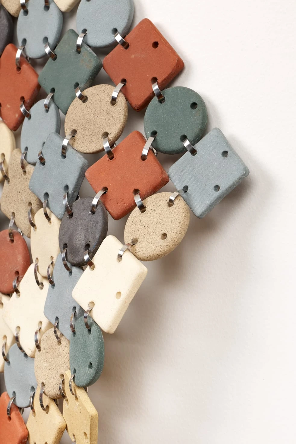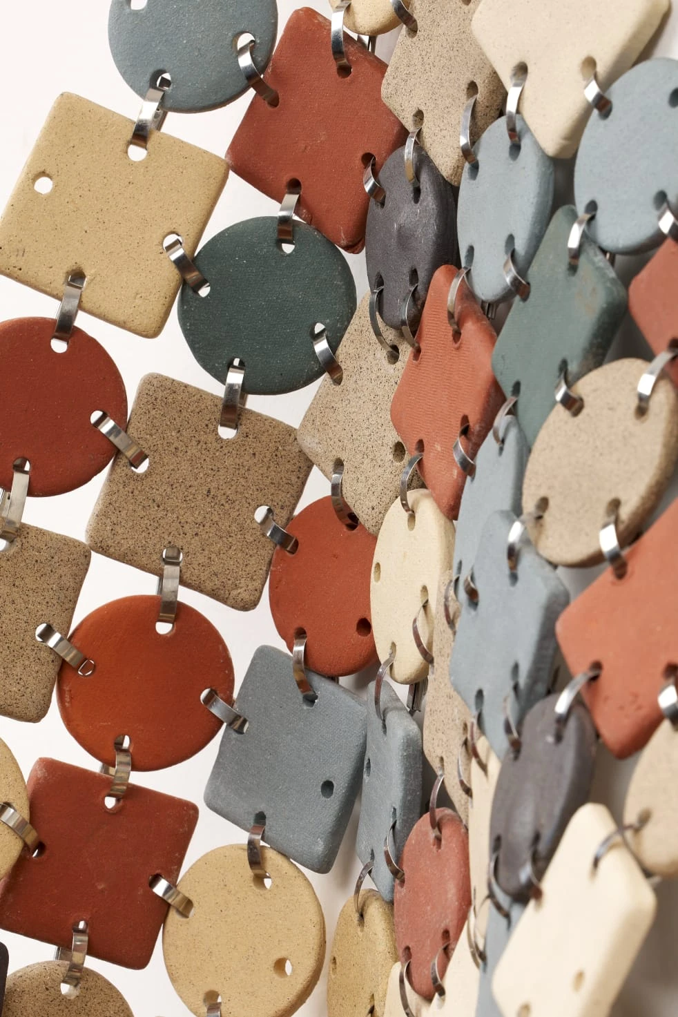 151 peças de argila azul, creme, preta, shiro, tabaco, terracota e verde circulares de 5x5x0,5 cm e quadrados de 5x5x0,5 cm queimadas em 2 etapas em temperatura de 1200ºc. 184 abraçadeiras de alumínio