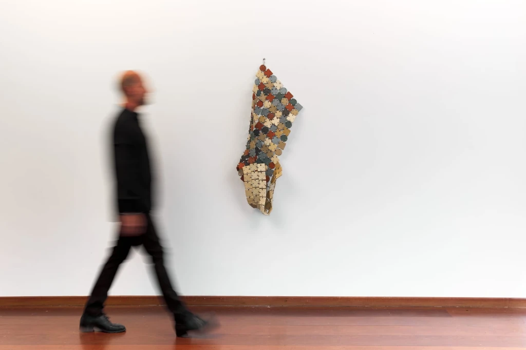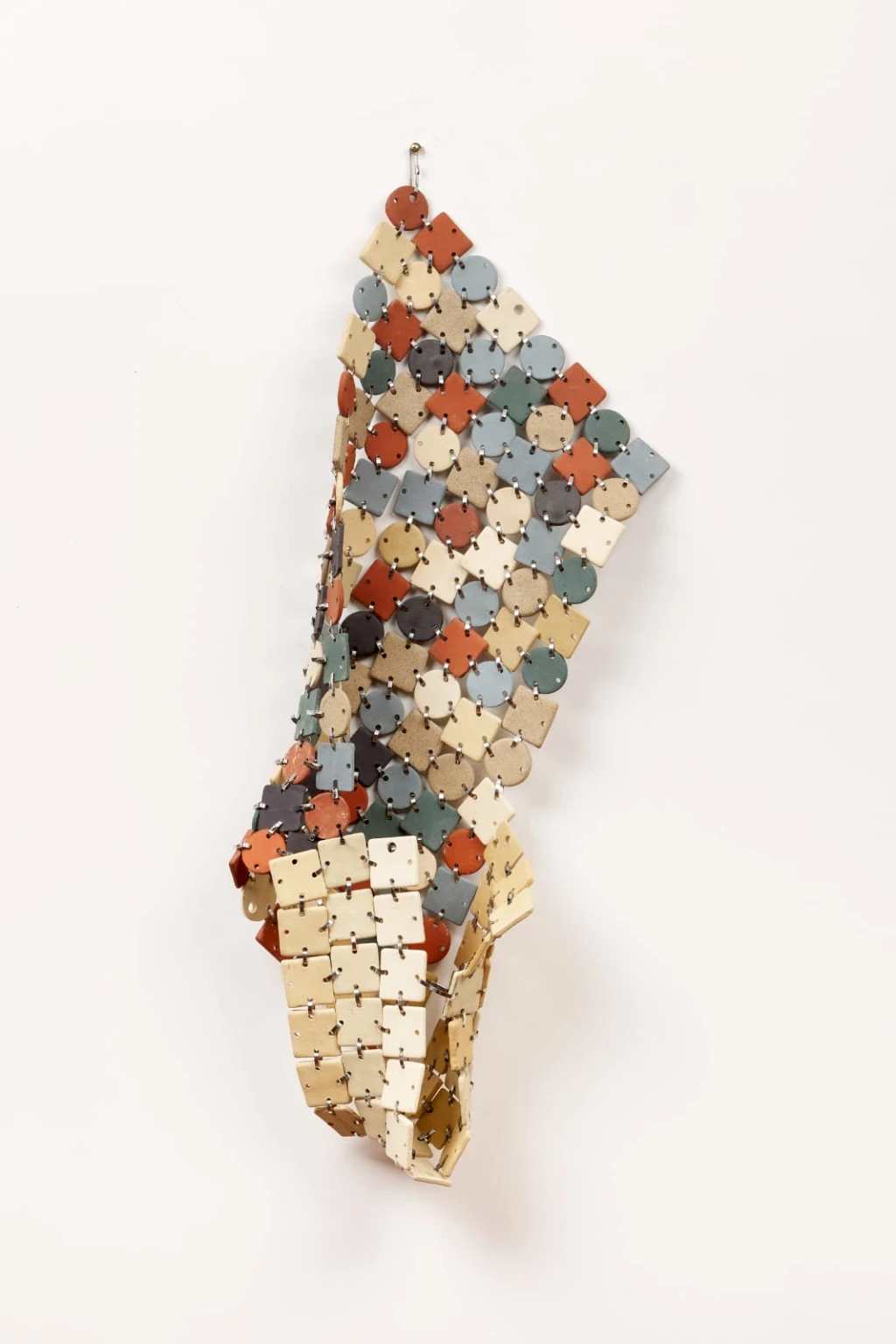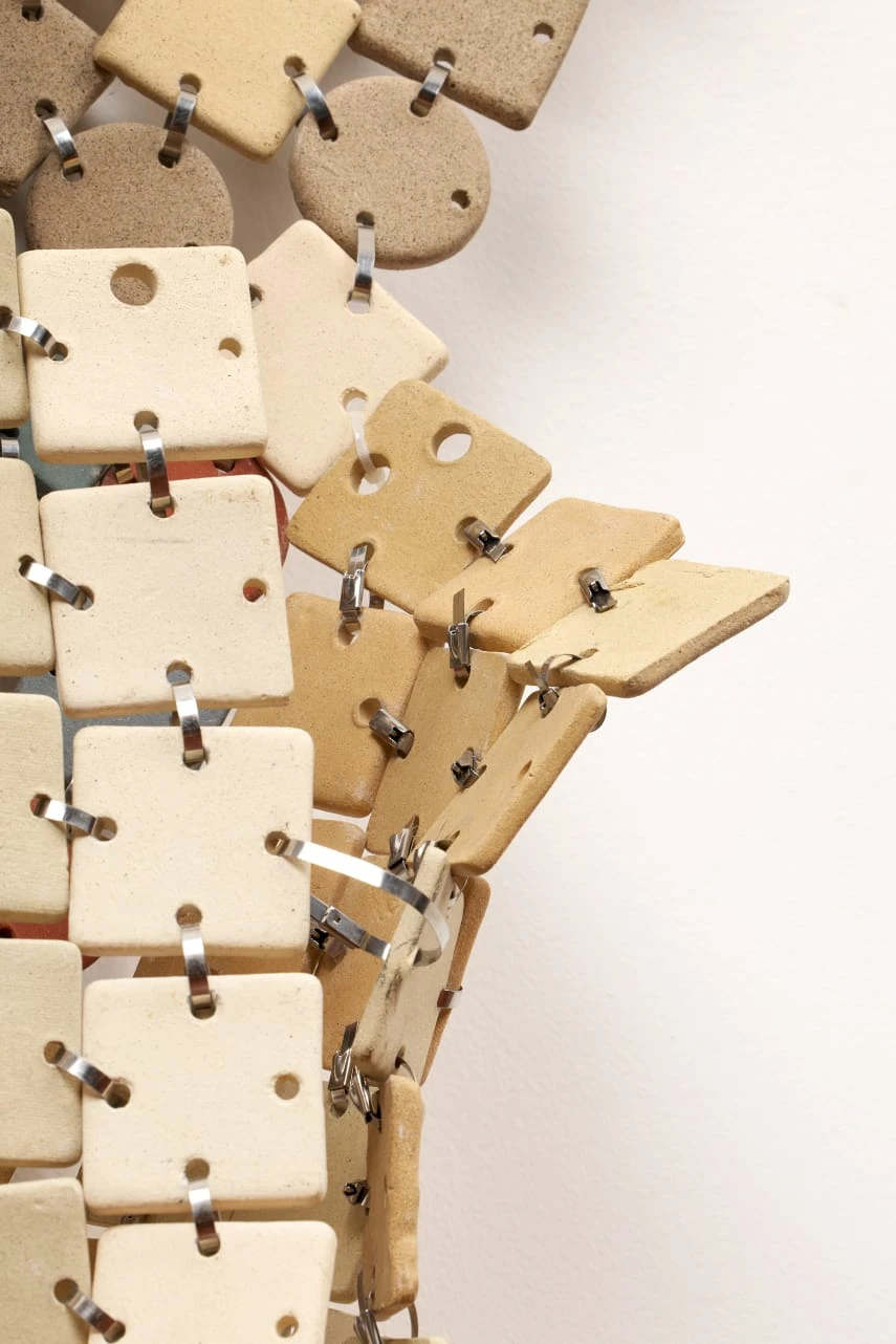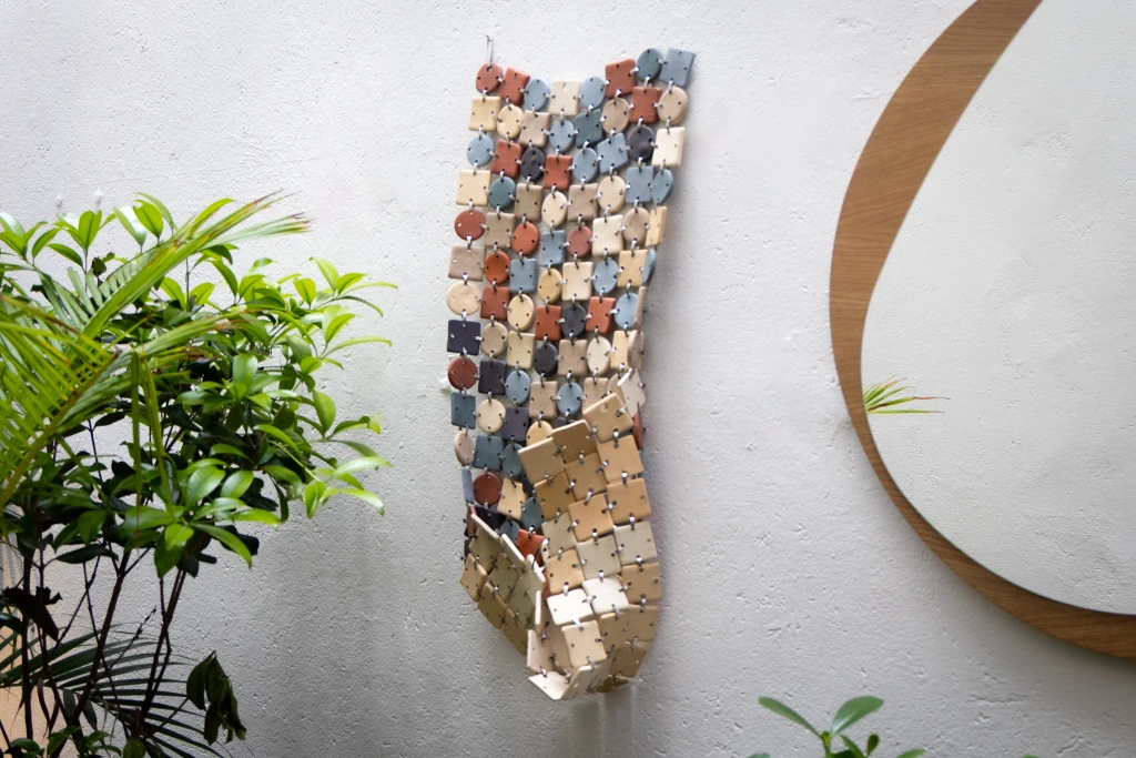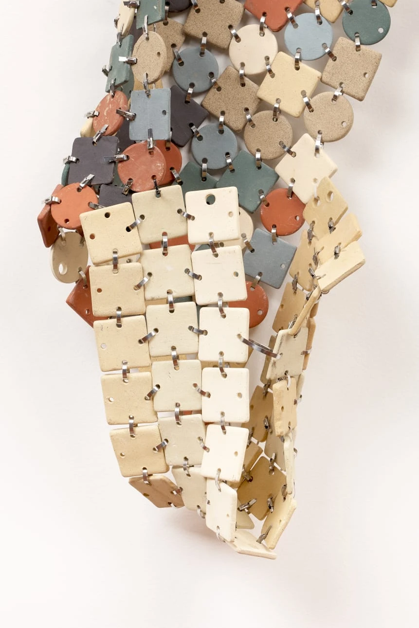 151 peças de argila azul, creme, preta, shiro, tabaco, terracota e verde circulares de 5x5x0,5 cm e quadrados de 5x5x0,5 cm queimadas em 2 etapas em temperatura de 1200ºc. 184 abraçadeiras de alumínio