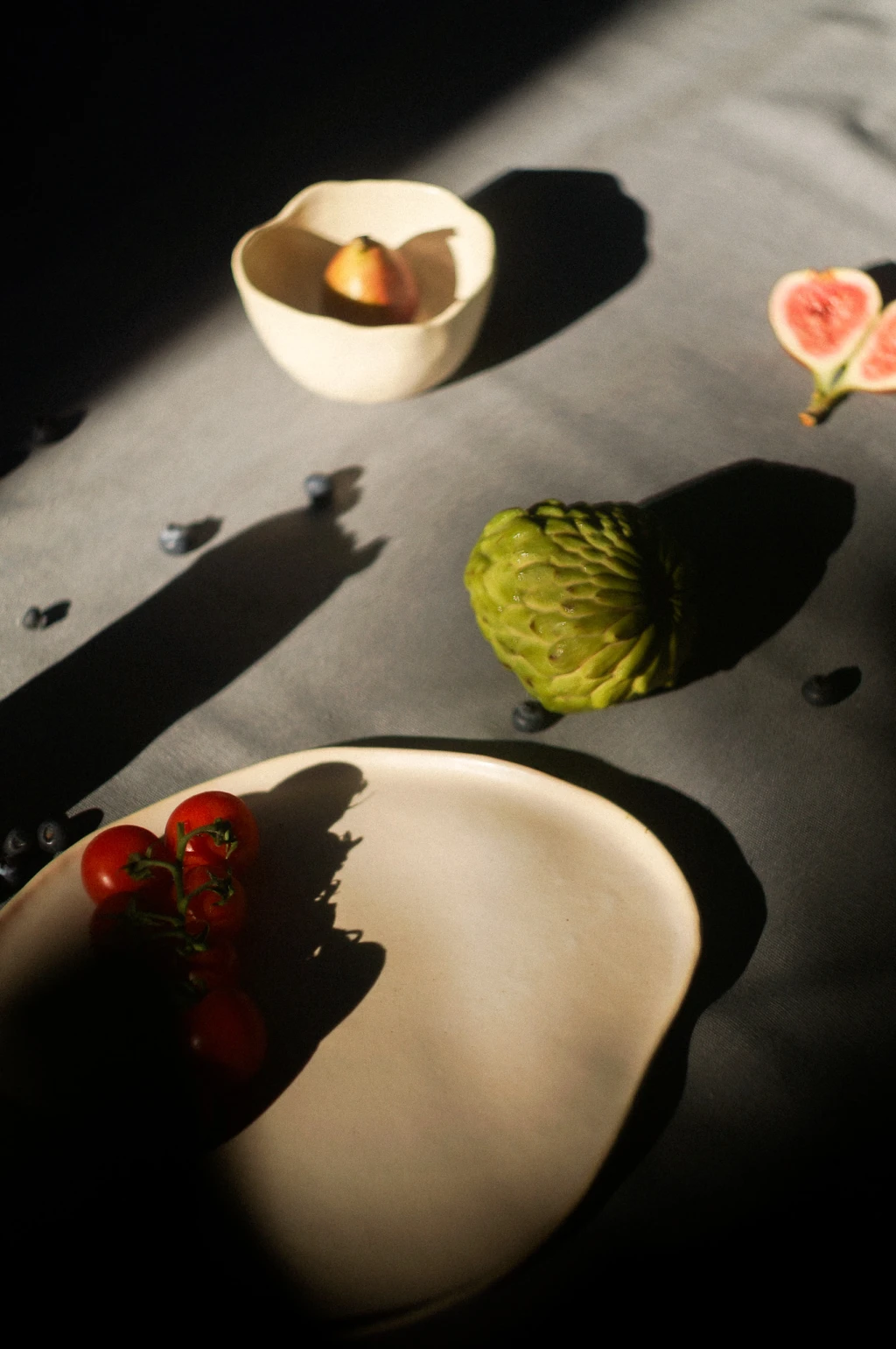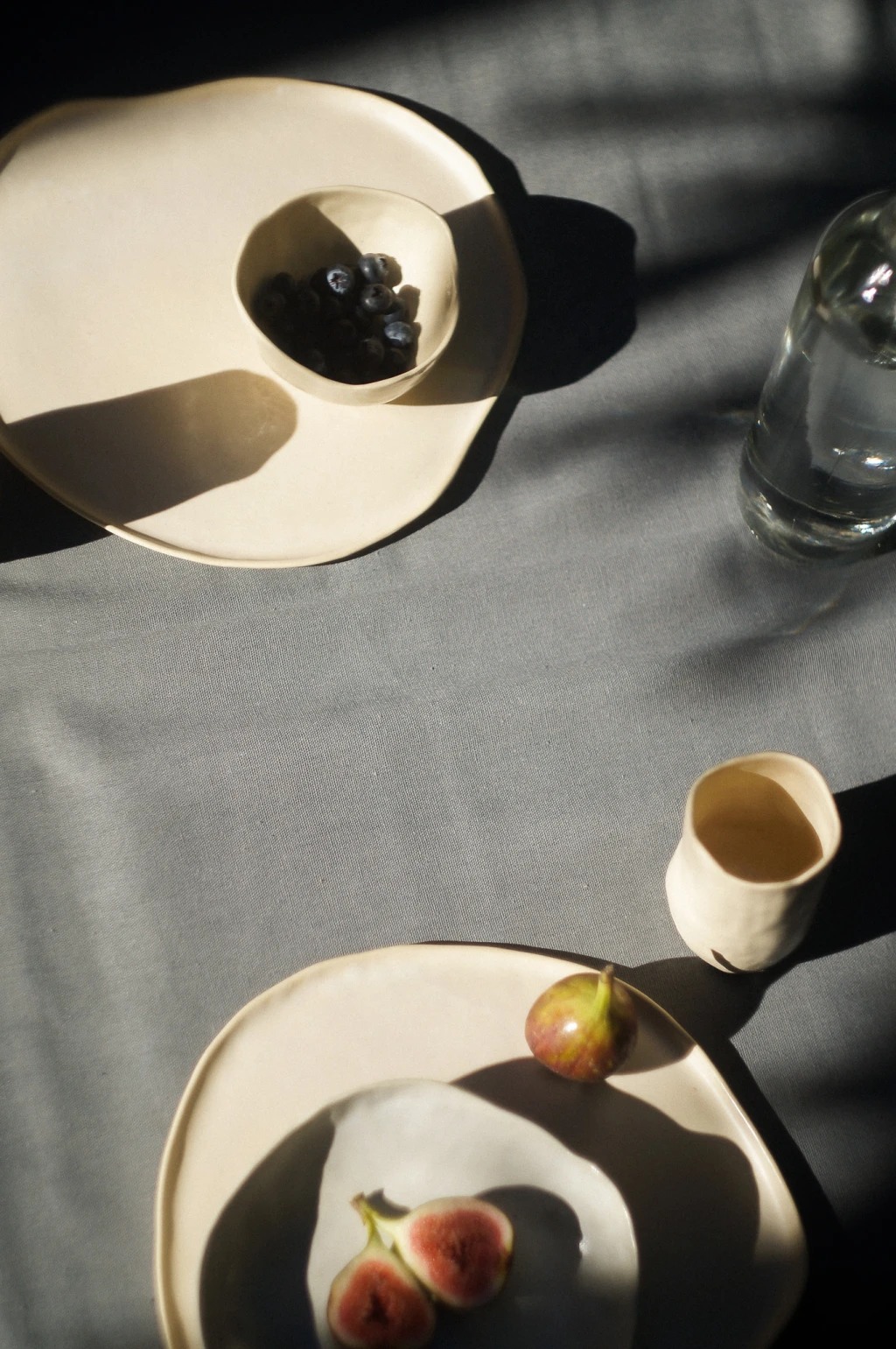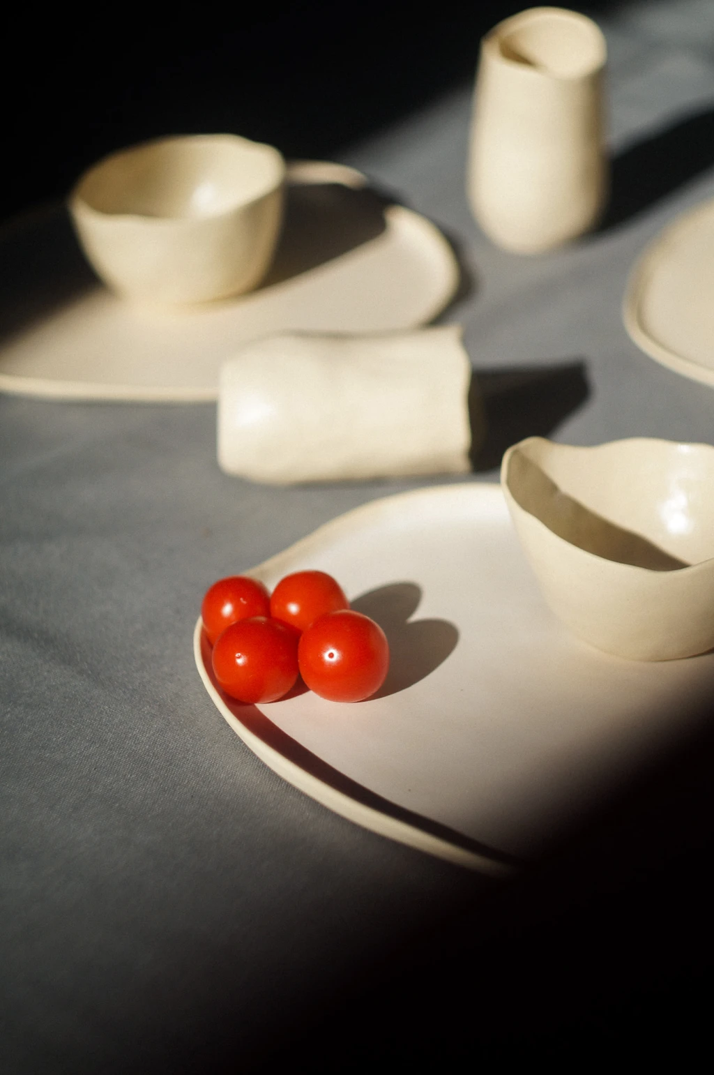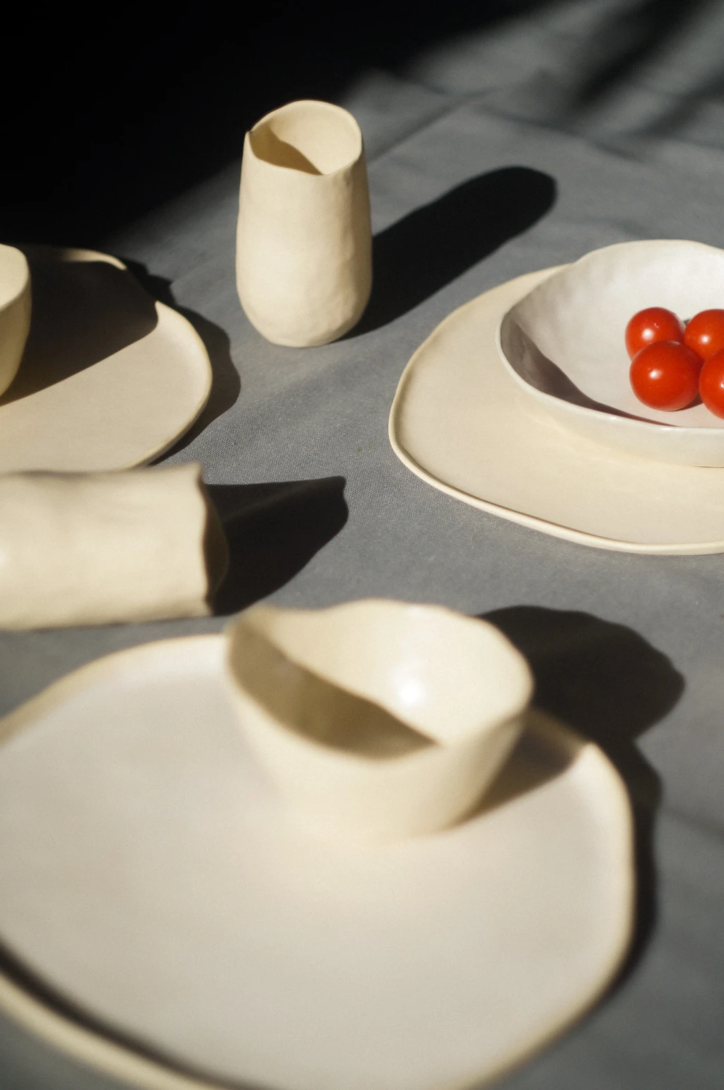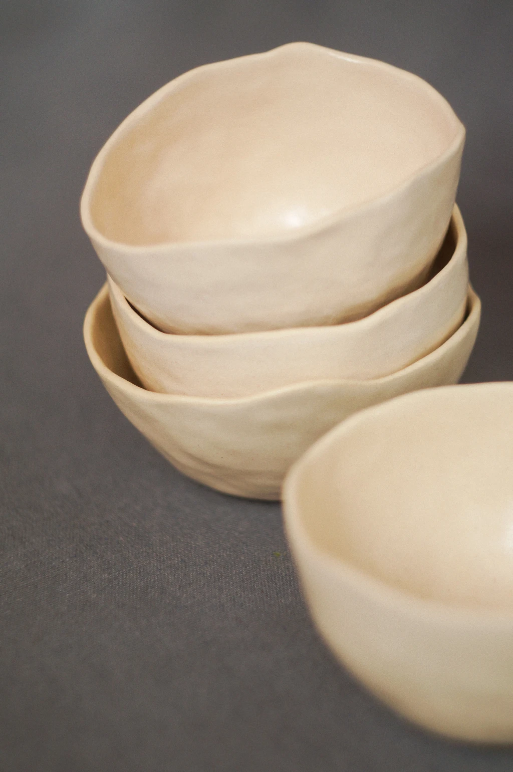 Pecas modeladas uma a uma através da técnica pinch-pot - que consiste em apertar e orientar o volume de argila através do pinçar dos dedos.